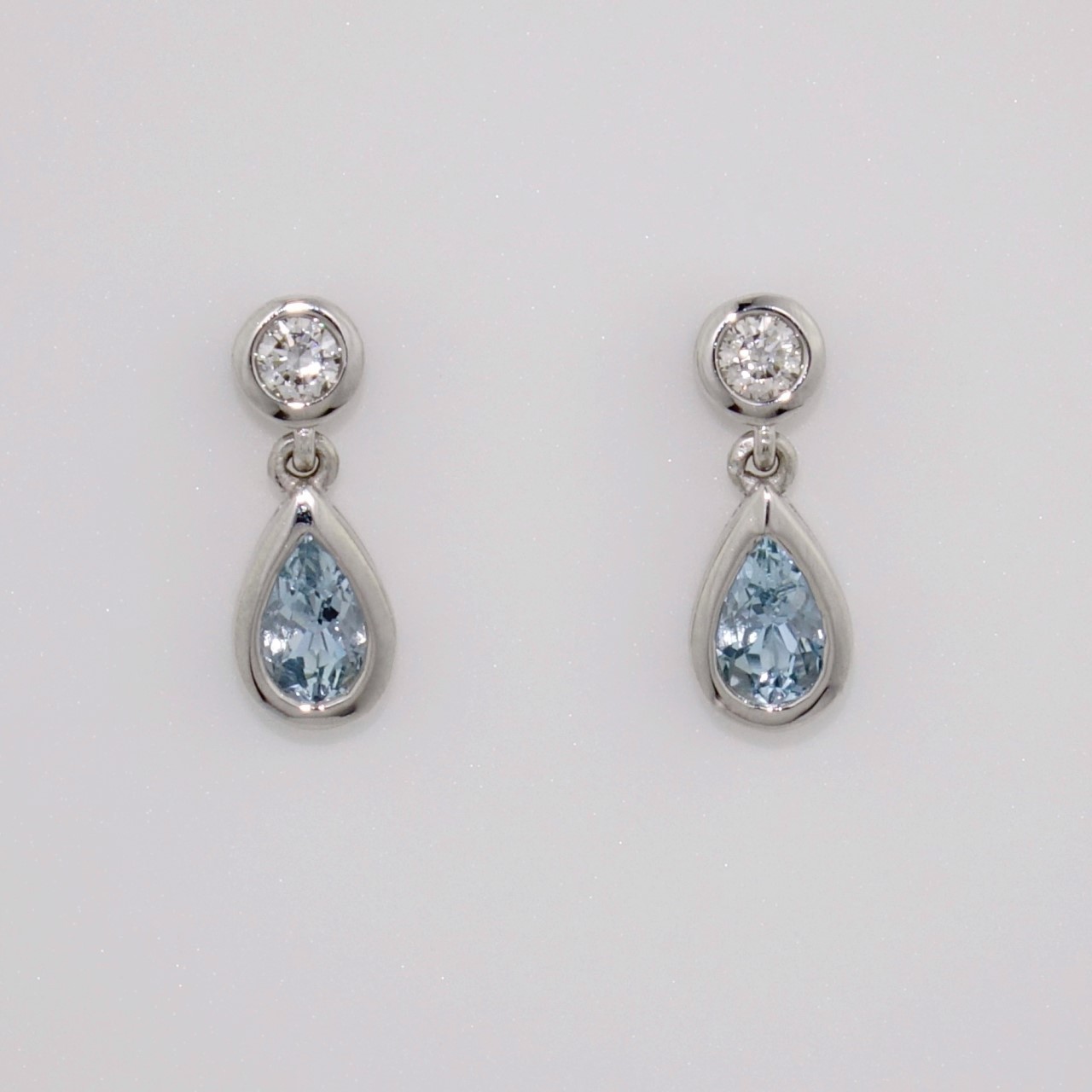 These pear cut aquamarines are set below single round brilliant cut diamonds in contemporary rubover settings. These earrings fasten securely and comfortably with post and butterfly fittings, and they have some movement to catch the light.