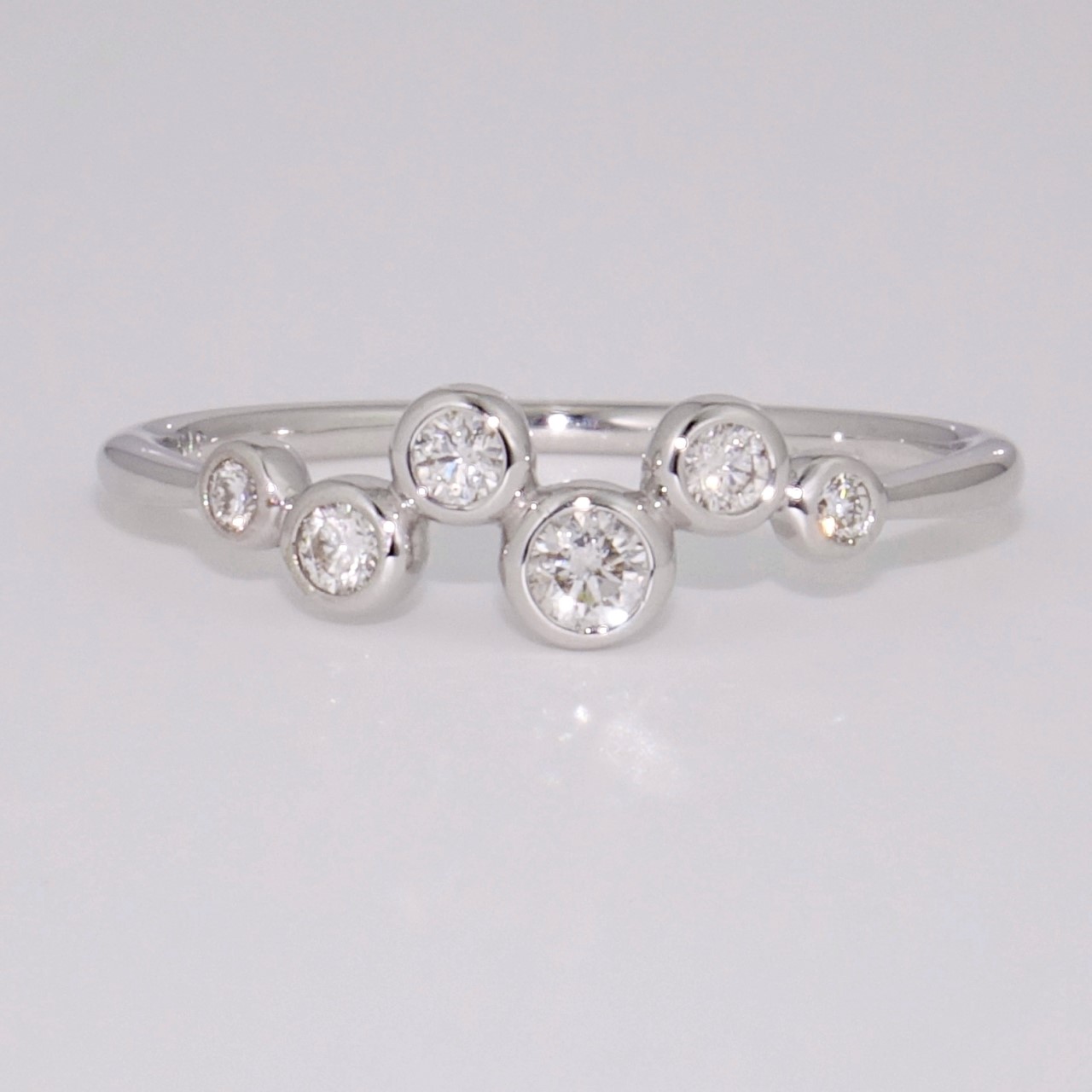 This is the narrowest style in our range of popular bubble rings. The six round brilliant cut diamonds are in rubover settings and this ring is ideal for everyday wear or a special occasion.