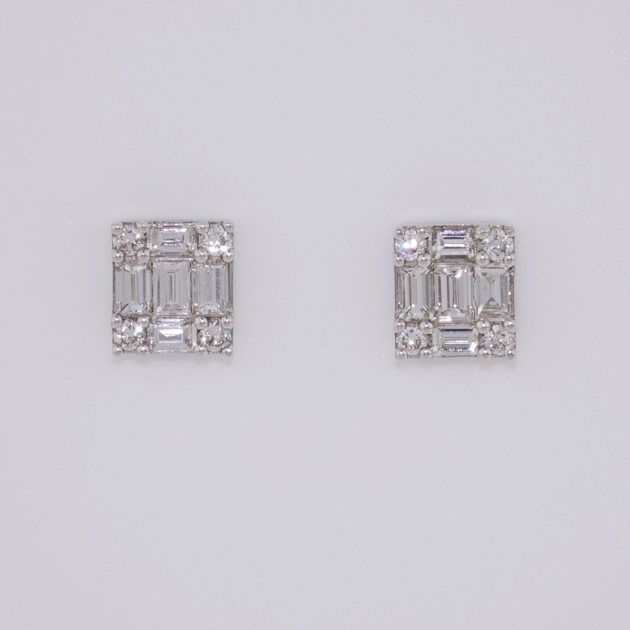 These sparkling earrings feature a cluster of round brilliant cut and baguette cut diamonds, set to look like one larger diamond. These fasten securely and comfortably with post and butterfly fittings.