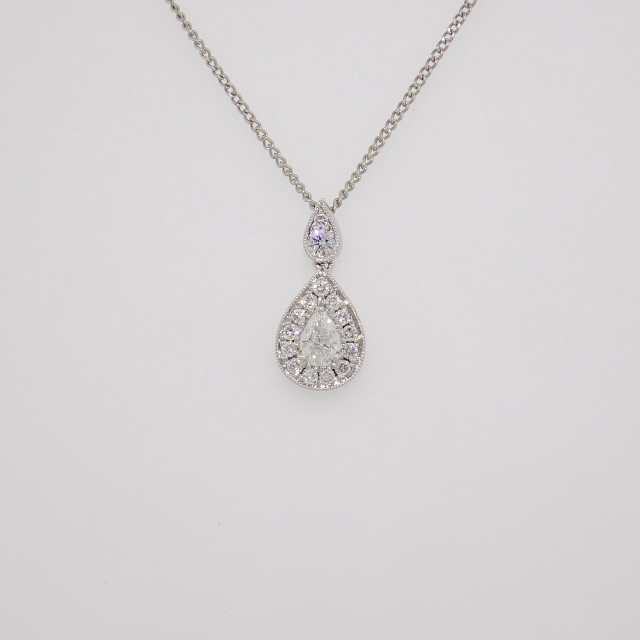 This beautiful pendant features a pear cut diamond surrounded by a cluster of diamonds, and a diamond-set bail. The milgrain edge offers a vintage feel.