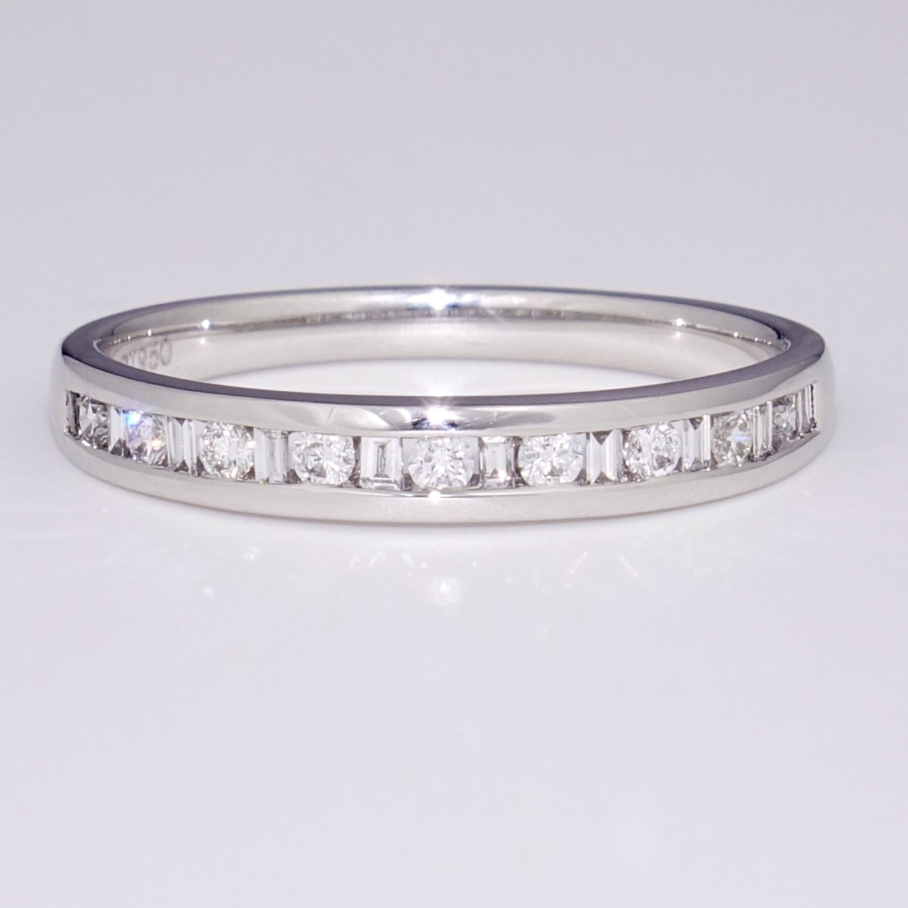 This popular ring features alternating round brilliant cut and baguette cut diamonds in a channel setting.