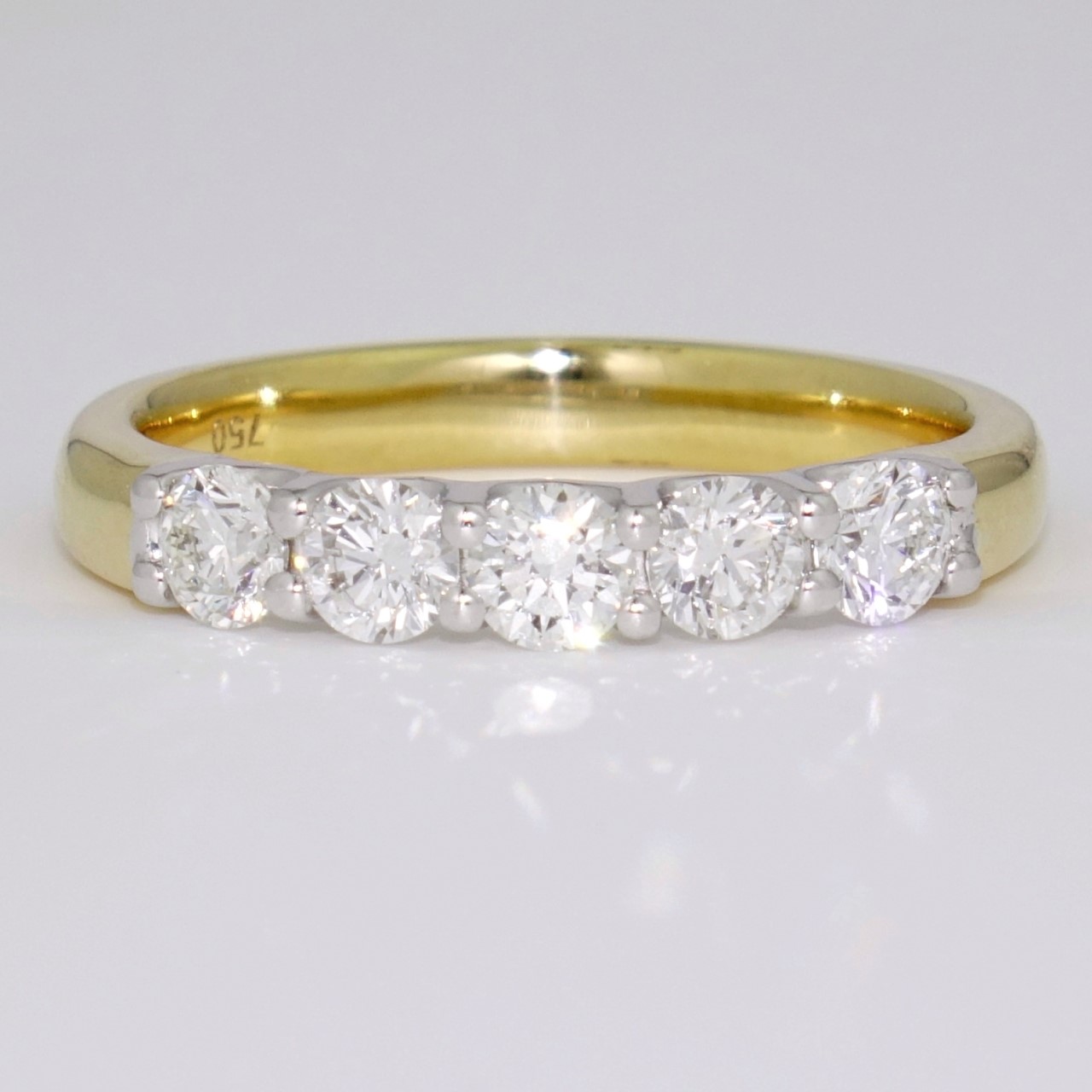 This classic ring features five round brilliant cut diamonds in simple claw settings. This can be worn alone or beside other rings.