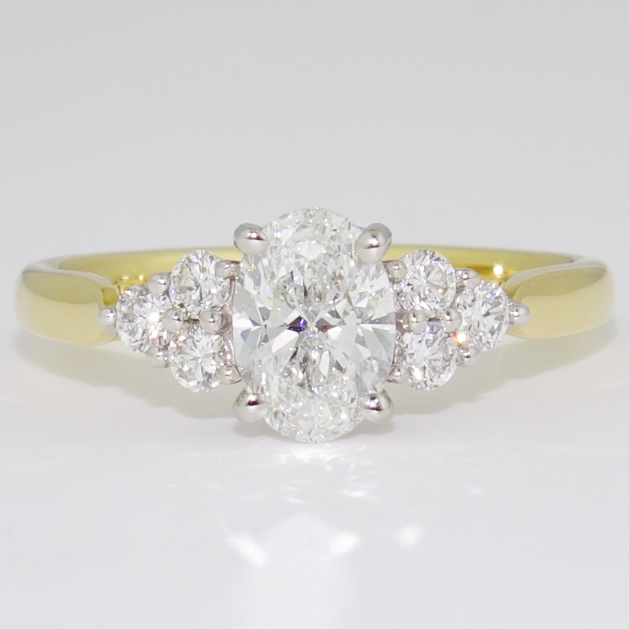 We've set this sparkling certificated oval cut diamond with three round brilliant cut diamonds on each side in this dazzling ring.