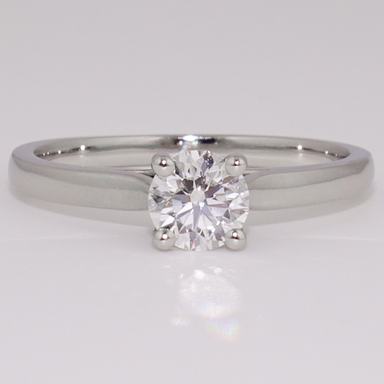 This dazzling ring features a certificated D colour round brilliant cut diamond in a four claw platinum setting. D colour diamonds have been graded as being absolutely colourless, making them incredibly rare as well as beautiful.