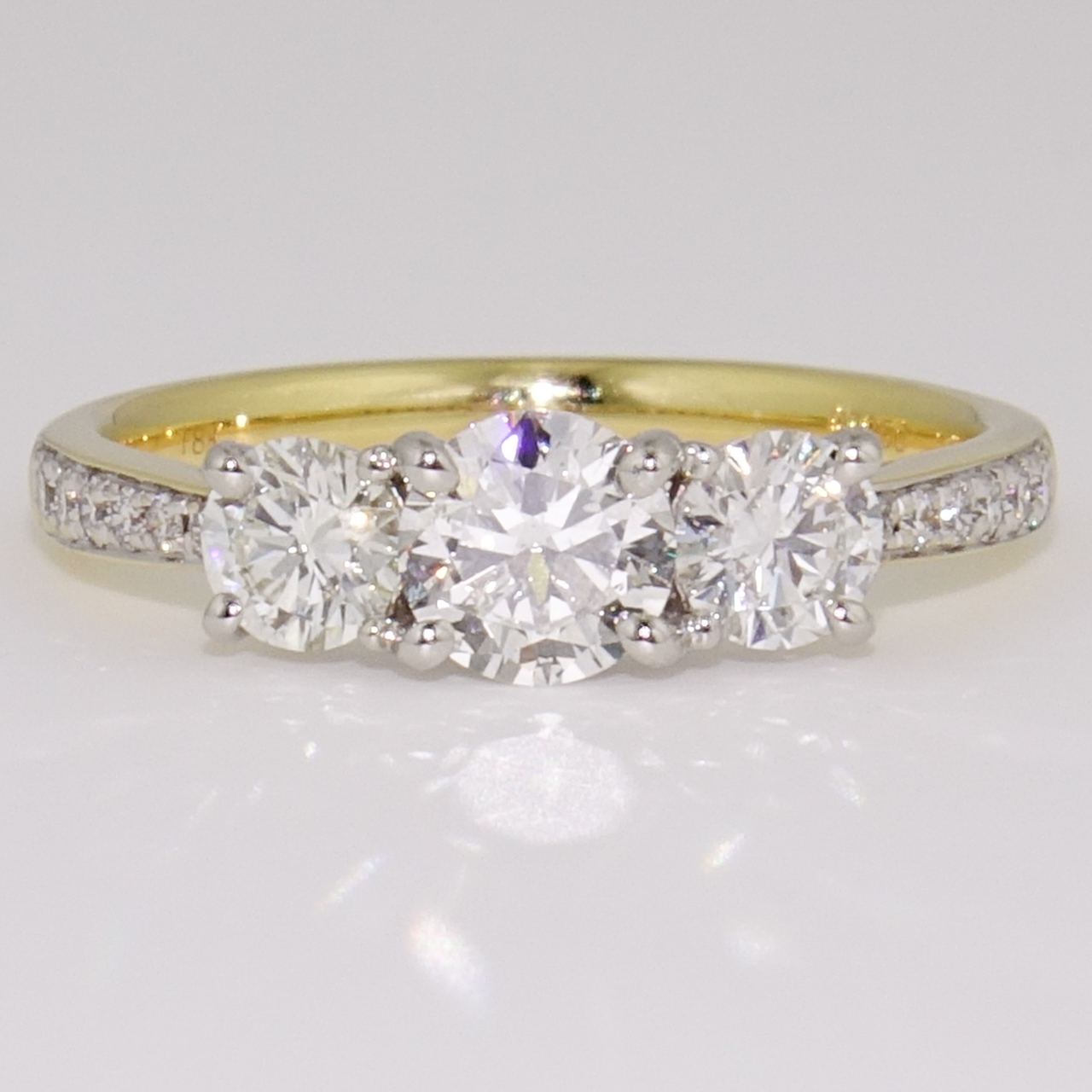 This dazzling ring features three round brilliant cut diamonds and diamond-set shoulders for plenty of sparkle.