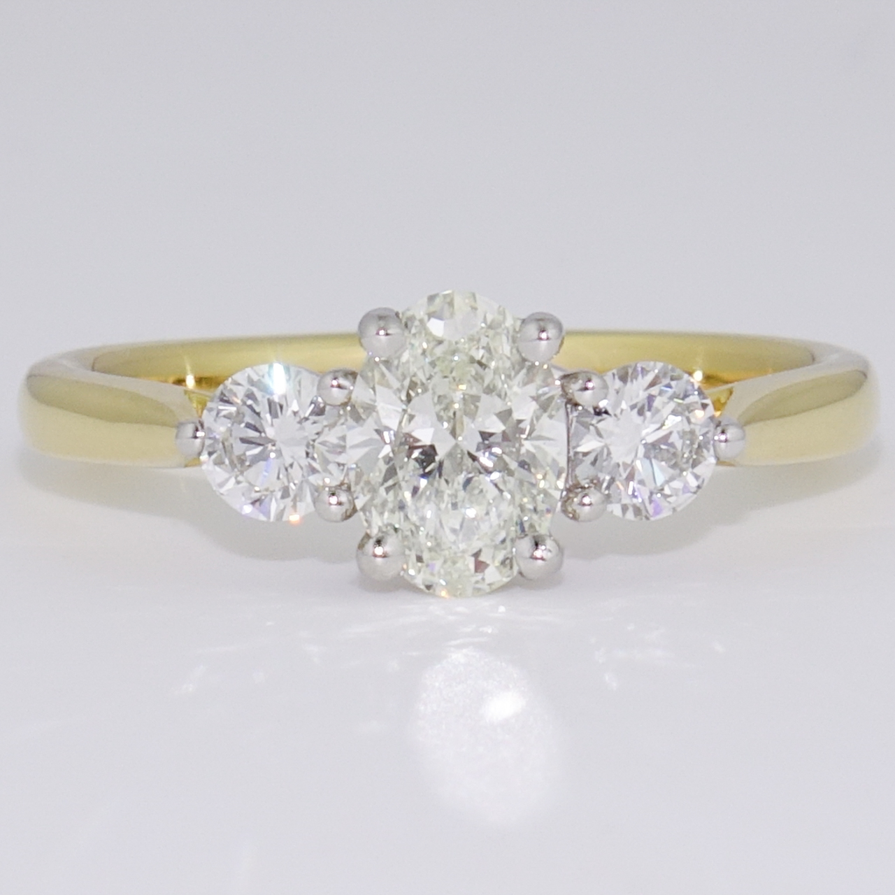 We've set this sparkling certificated oval cut diamond between two round brilliant cut diamonds in this fabulous ring.