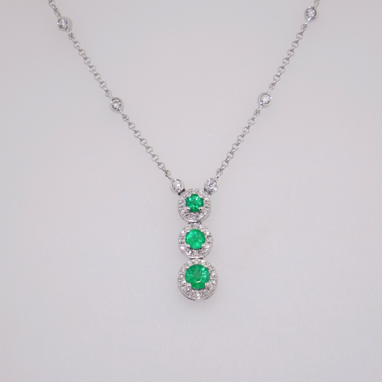 This stunning necklace features three graduated round emerald and diamond clusters, with a diamond-set chain for extra sparkle.