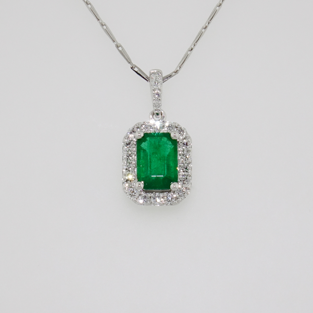 This fabulous pendant features an emerald cut emerald surrounded by sparkling round brilliant cut diamonds, and a diamond-set bale.