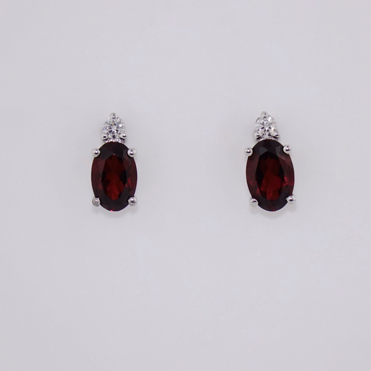These popular earrings feature oval cut garnets set below single round brilliant cut diamonds. These fasten securely and comfortably with post and butterfly fittings.
