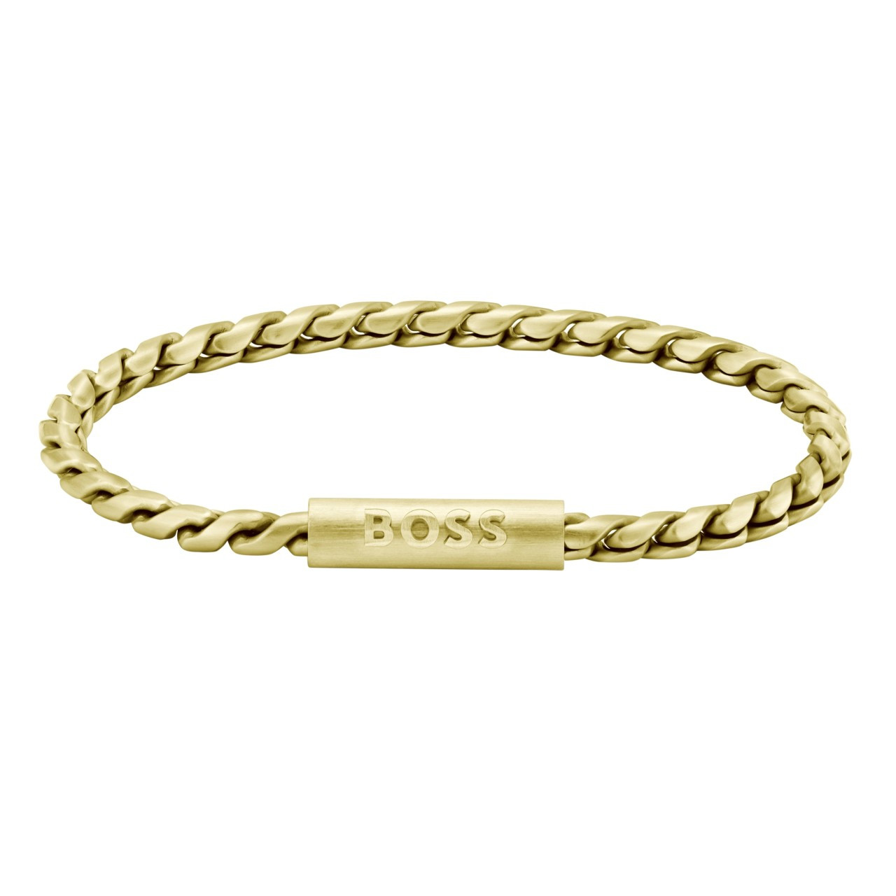 BOSS gents' bracelet from the Doran collection. Featuring a light yellow gold IP stainless steel braided metal link bracelet with BOSS branded magnetic closure.