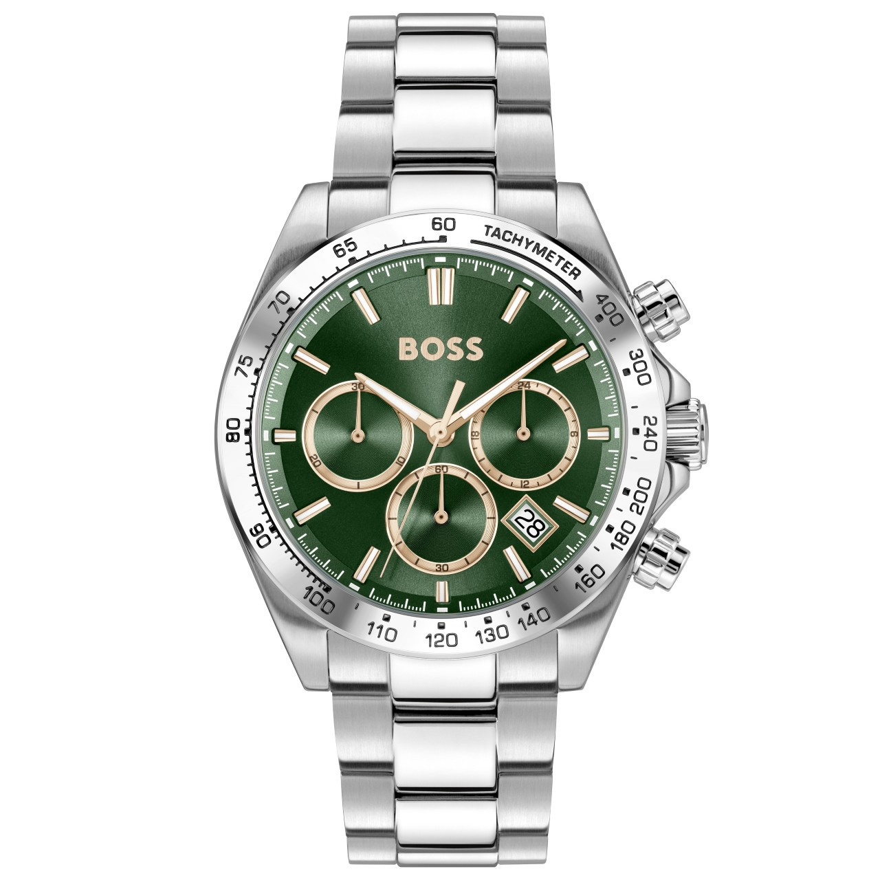 Gents' BOSS chronograph with date window from the Hero family. Featuring a 43mm stainless steel case, green dial with date window, and a stainless steel three link bracelet.
