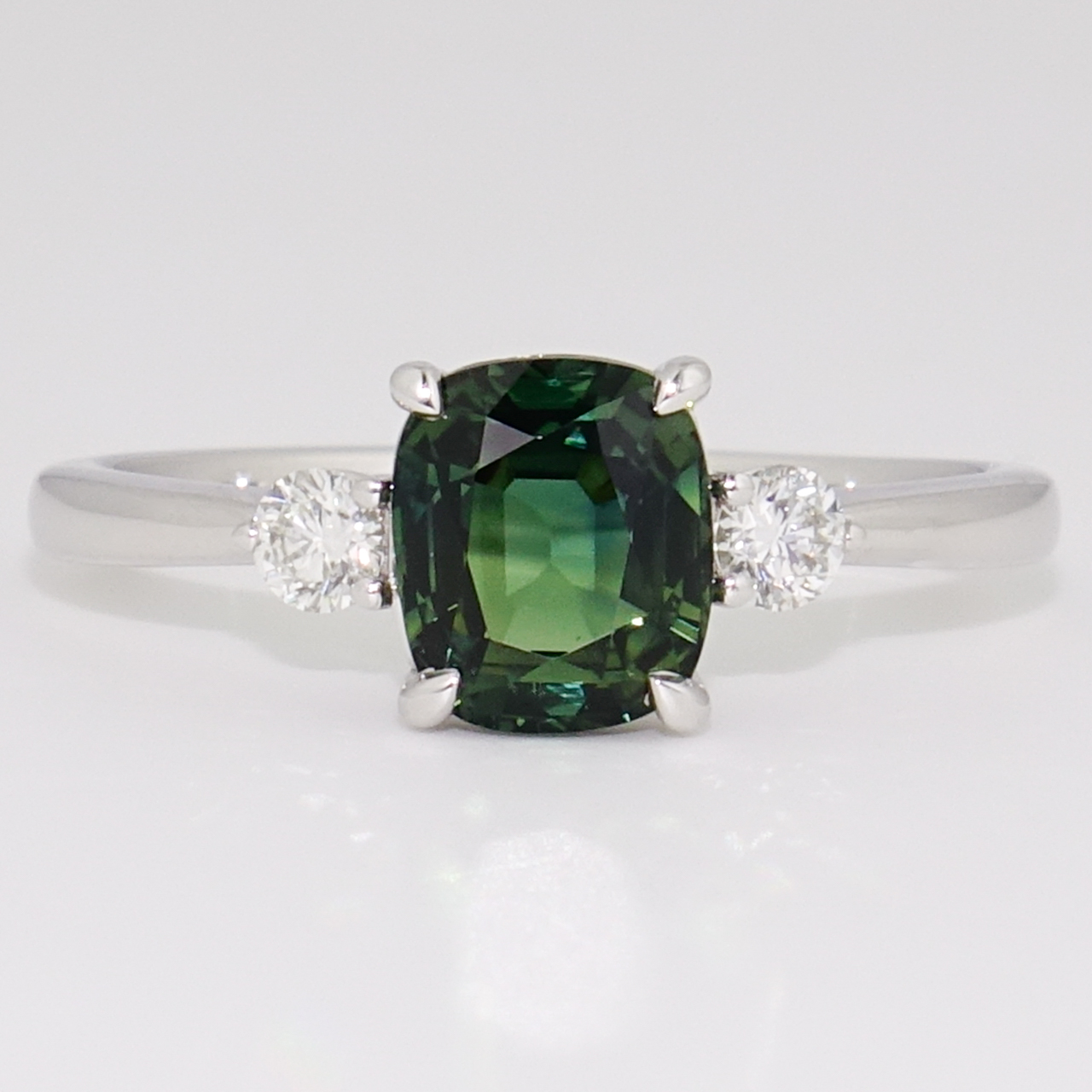We've set this luxurious rectangular cushion cut green sapphire between two sparkling round brilliant cut diamonds in this beautiful ring. This sapphire was found in Madagascar, and has a stunning deep green colour, which is complemented by the white of the diamonds.