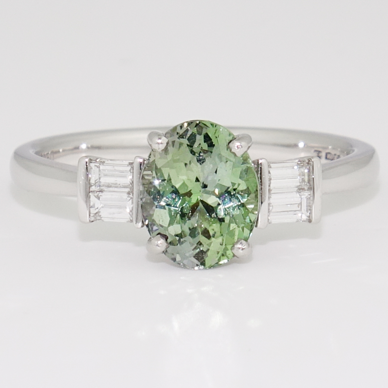 We've set this oval cut green tanzanite with two baguette cut diamonds on either side in this unique ring. The tanzanite is predominantly green and shows purple when viewed at different angles.