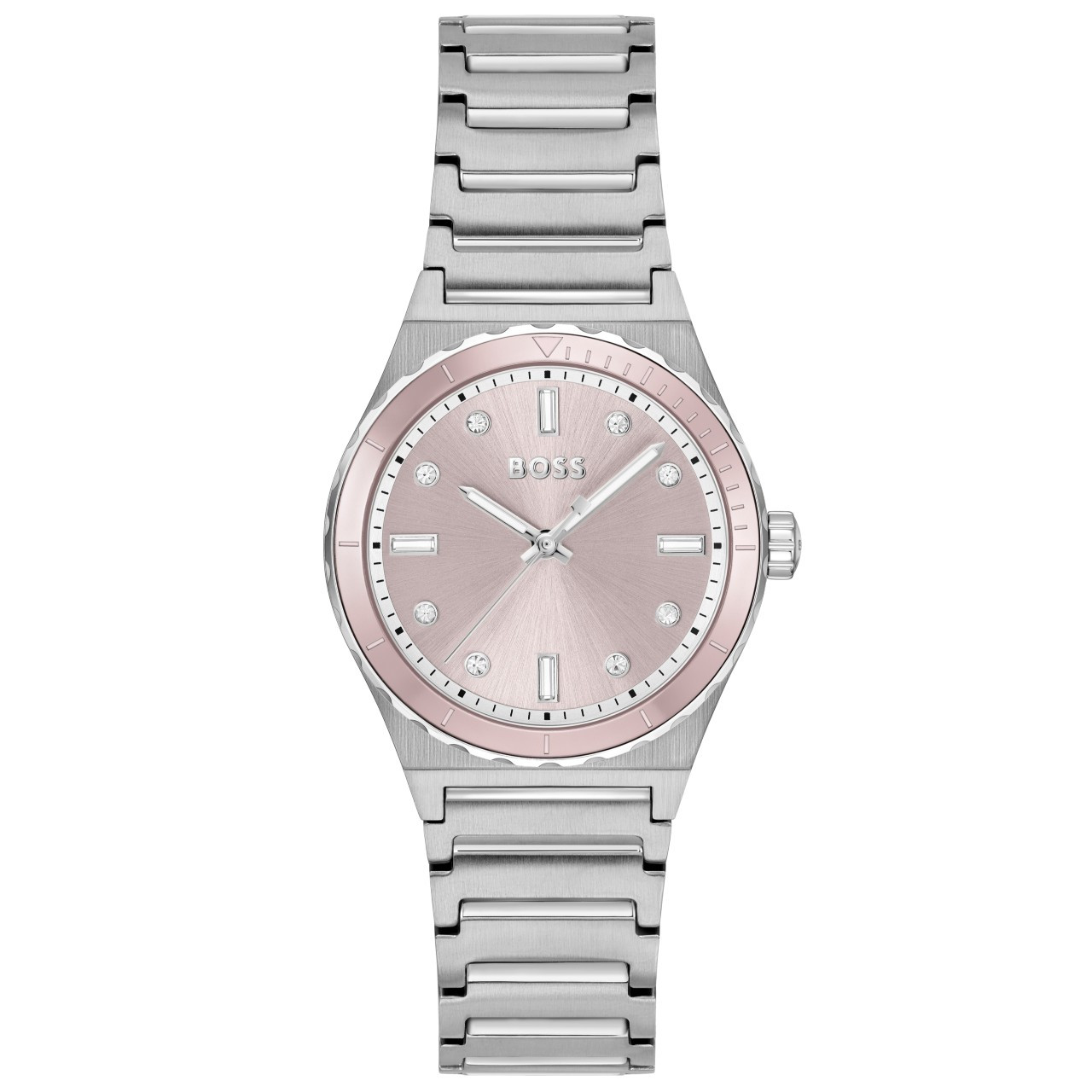 BOSS ladies 3 hand watch from the Candor Sport family. Featuring a 32mm stainless steel case, pink dial and bezel, and a stainless steel bracelet.
