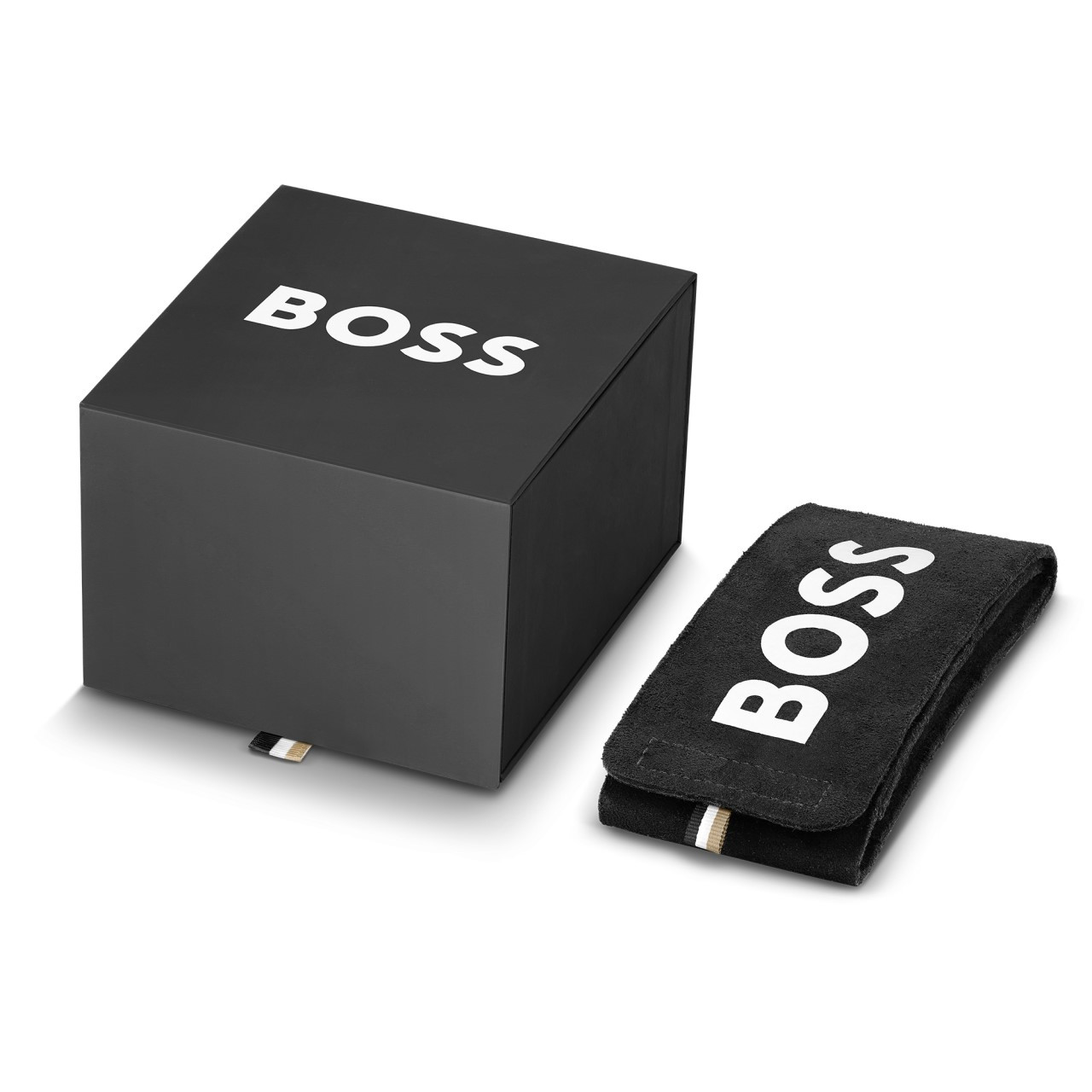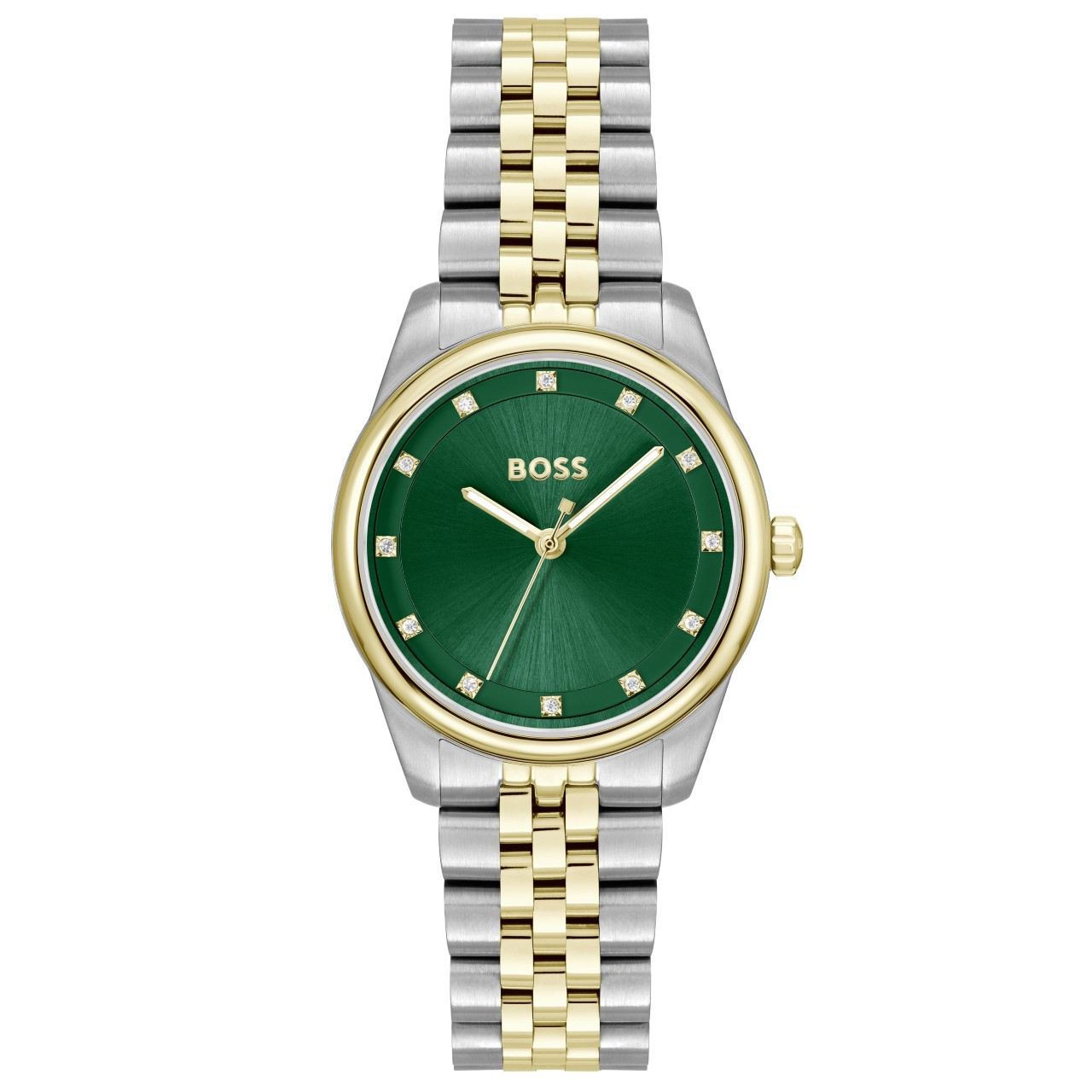 Ladies' BOSS three hand watch from the Graceful Precious family. Featuring a 32mm stainless steel case, green dial with crystal markers, and a stainless steel and light gold IP 5 link bracelet.