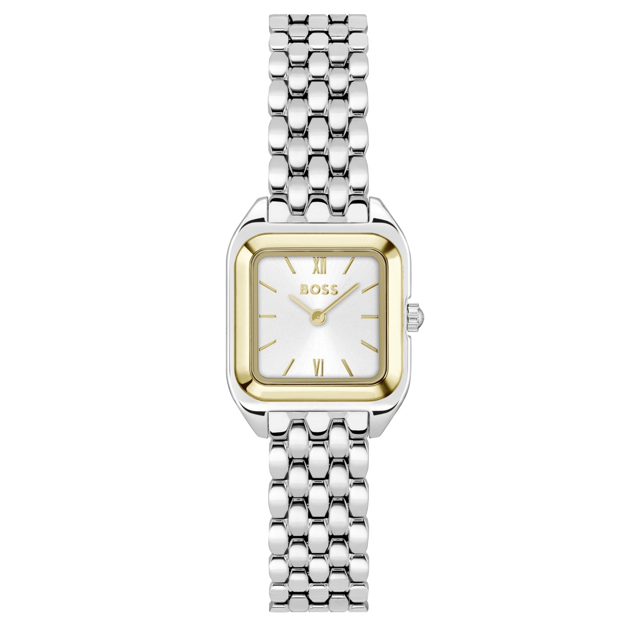 Ladies' BOSS two hand from the Mae Petite family. Featuring a 22x22.5mm soft square stainless steel case, light gold IP bezel, silver white dial with light gold IP markers, stainless steel 5 link bracelet. Water resistant to 3ATM.