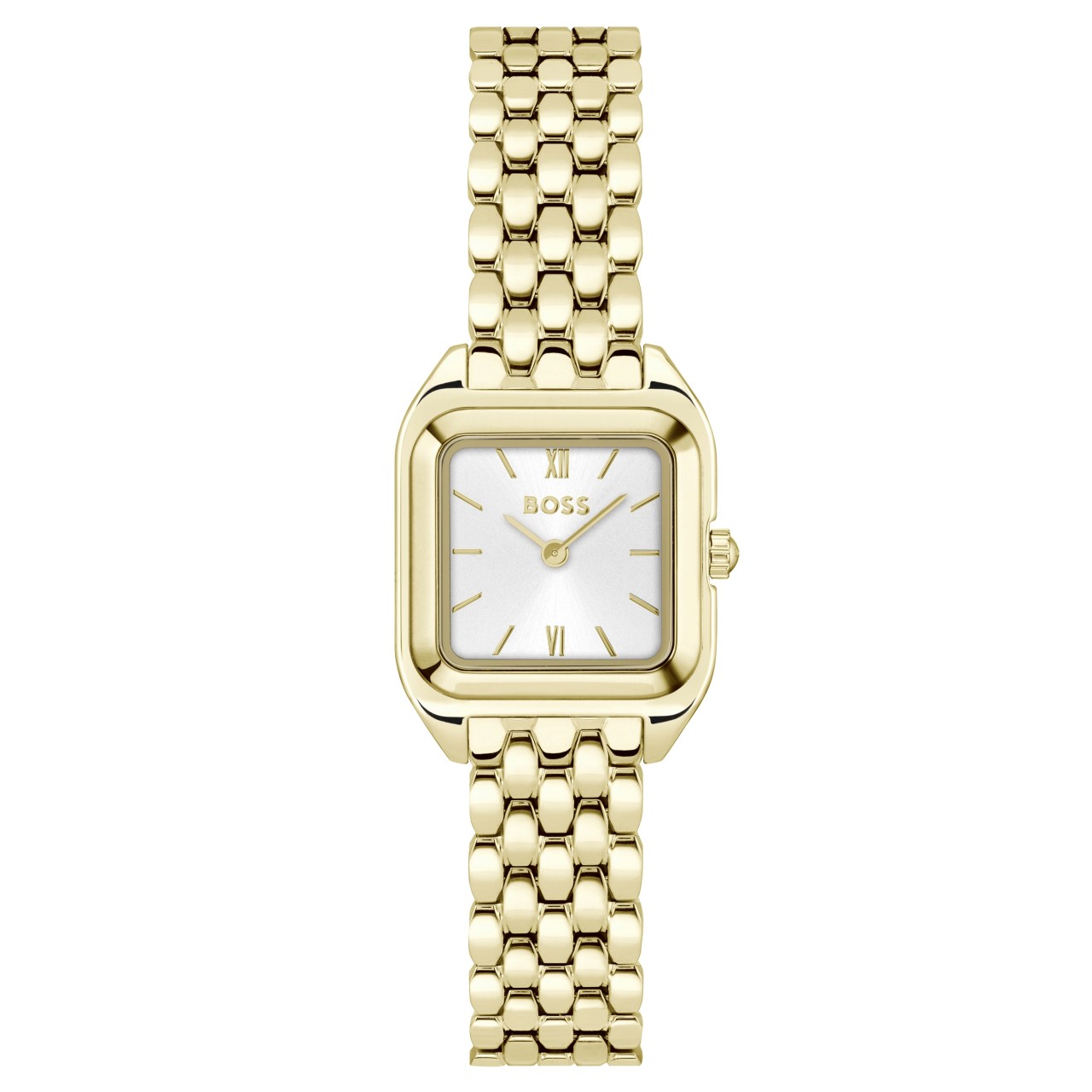 Ladies' BOSS two hand from the Mae Petite family. Featuring a 22x22.5mm soft square stainless steel case, light gold IP bezel, silver white dial with light gold IP markers, light gold IP 5 link bracelet. Water resistant to 3ATM.