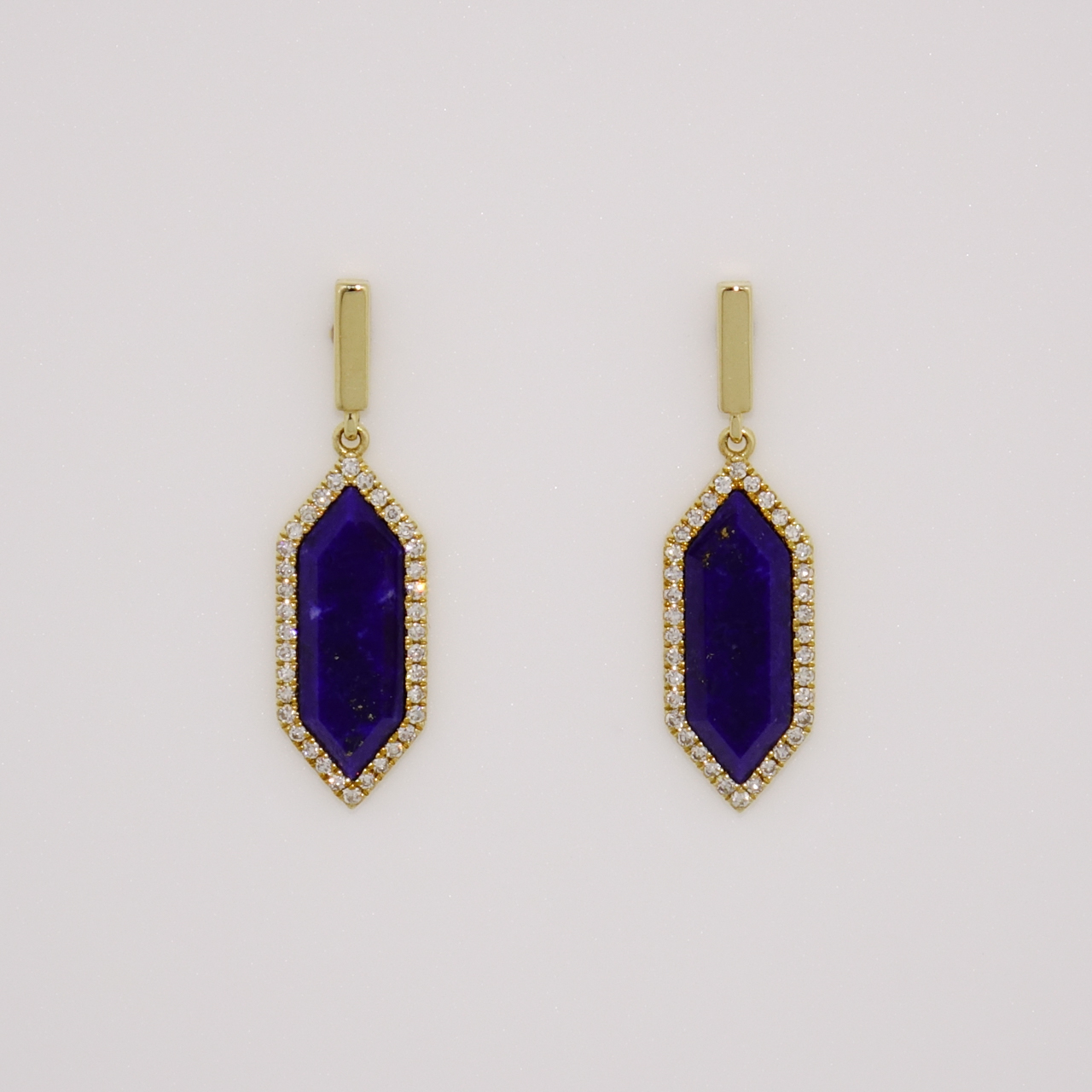 These gorgeous earrings feature long hexagon cut lapis lazuli surrounded by clusters of glittering diamonds. These are suspended from a sleek gold bar and fasten securely and comfortably with a post and butterfly.
