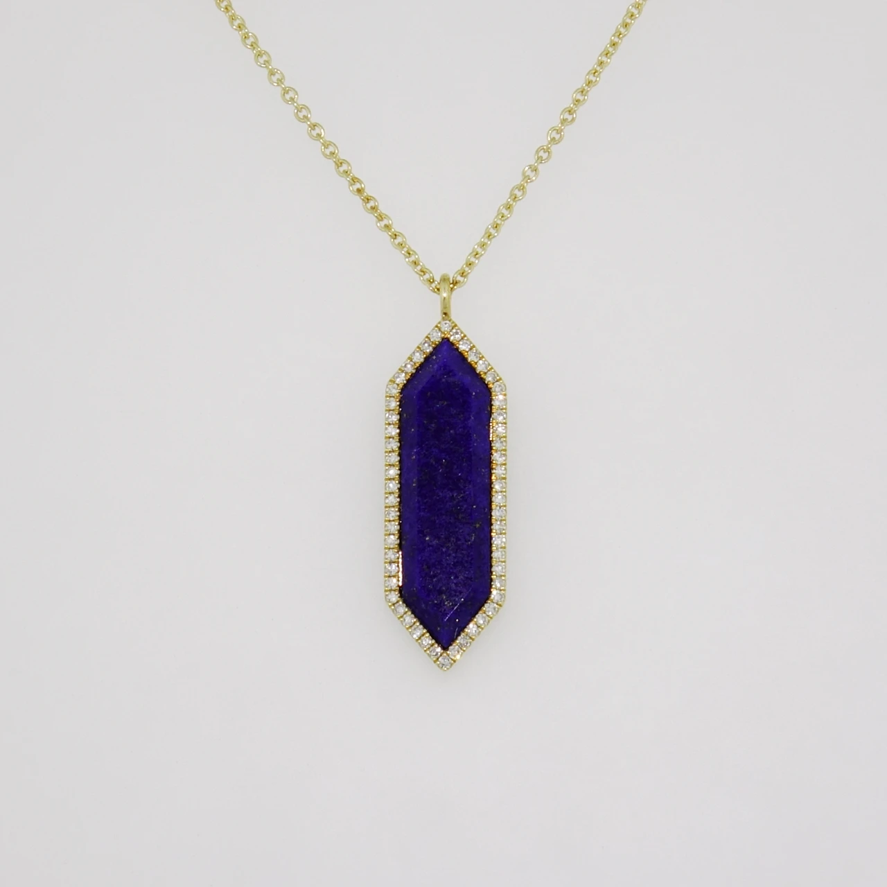 This gorgeous pendant features a long hexagon cut lapis lazuli surrounded by a halo of glittering diamonds.