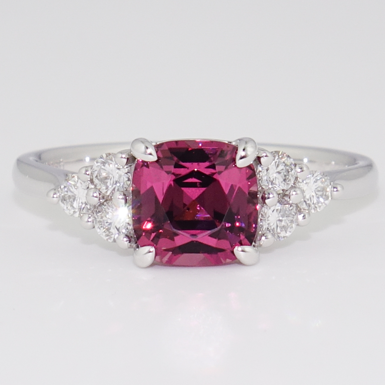 We've set this gorgeous cushion cut malaya garnet, which was found in Tanzania, with six sparkling round brilliant cut diamonds in this stunning ring.