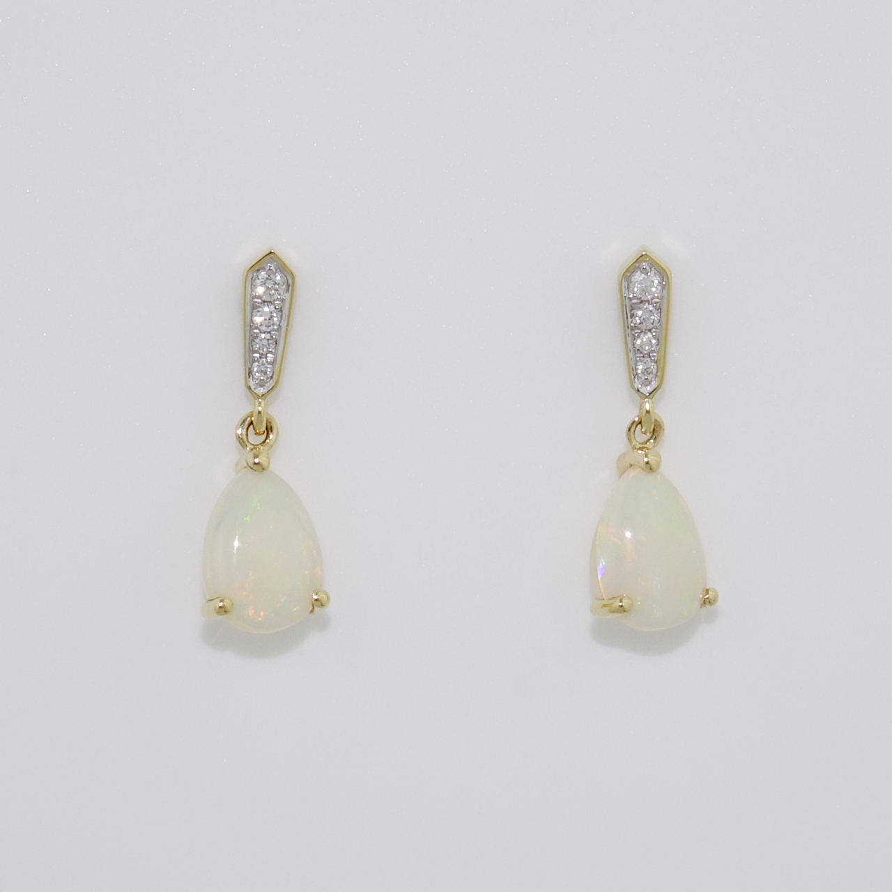 These elegant earrings feature pear cut cabochon opals set below diamond-set drops. These fasten securely and comfortably with post and butterfly fittings.