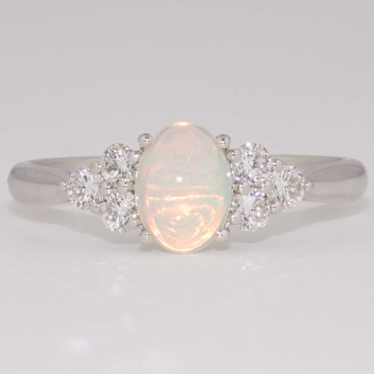 We've set this colourful oval cabochon cut Ethiopian opal with six sparkling round brilliant cut diamonds in this beautiful ring.