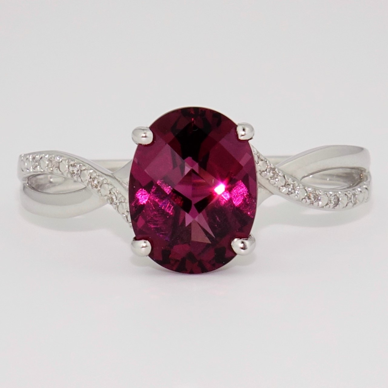 We've set this oval cut raspberry garnet with sparkling diamond-set crossover shoulders in this beautiful ring.