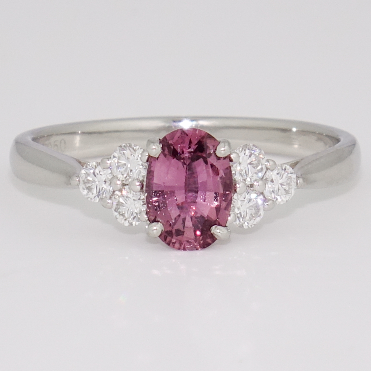 We've set this unheated oval cut raspberry sapphire with six round brilliant cut diamonds in this stunning ring.
