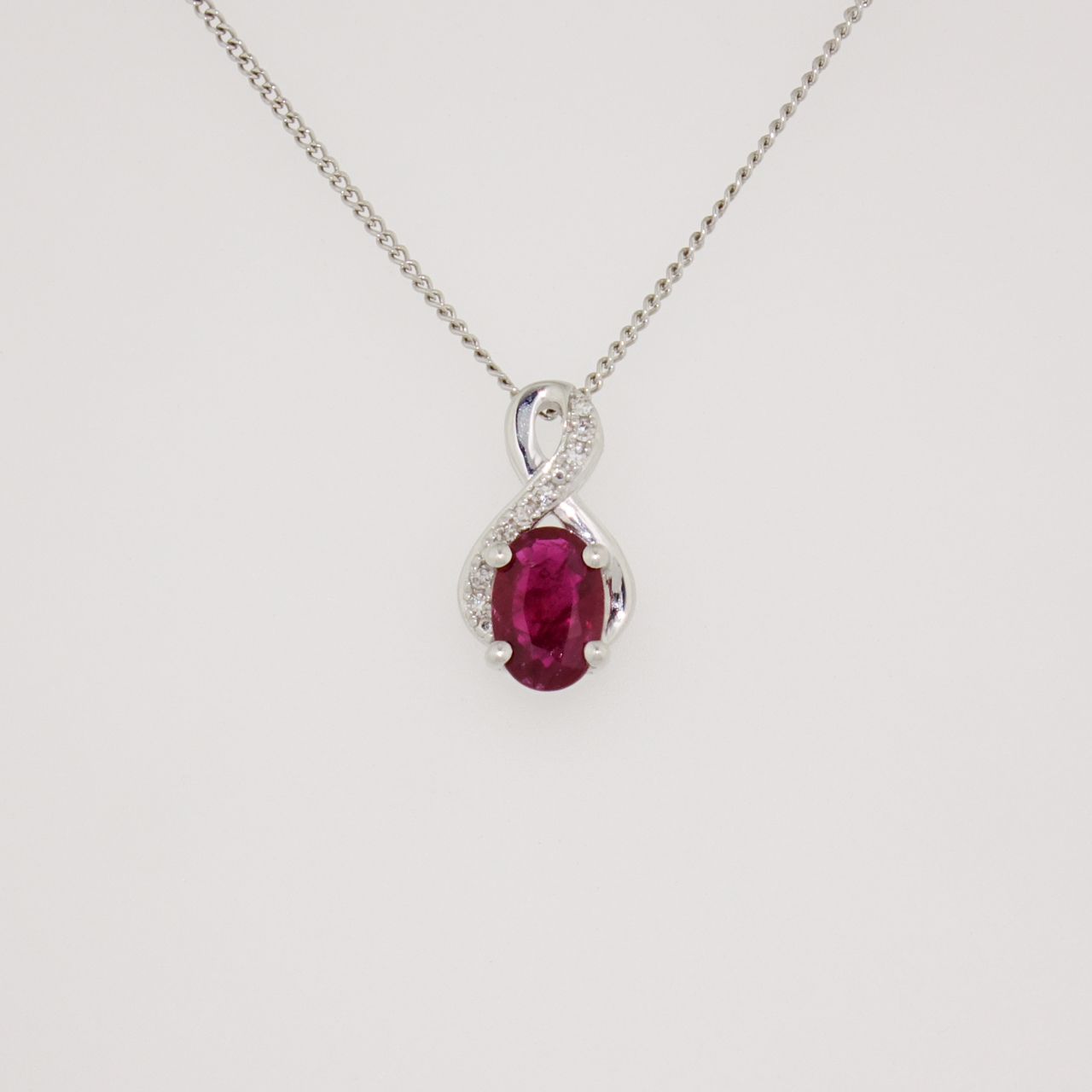 This beautiful pendant features an oval cut ruby set with a diamond swirl.
