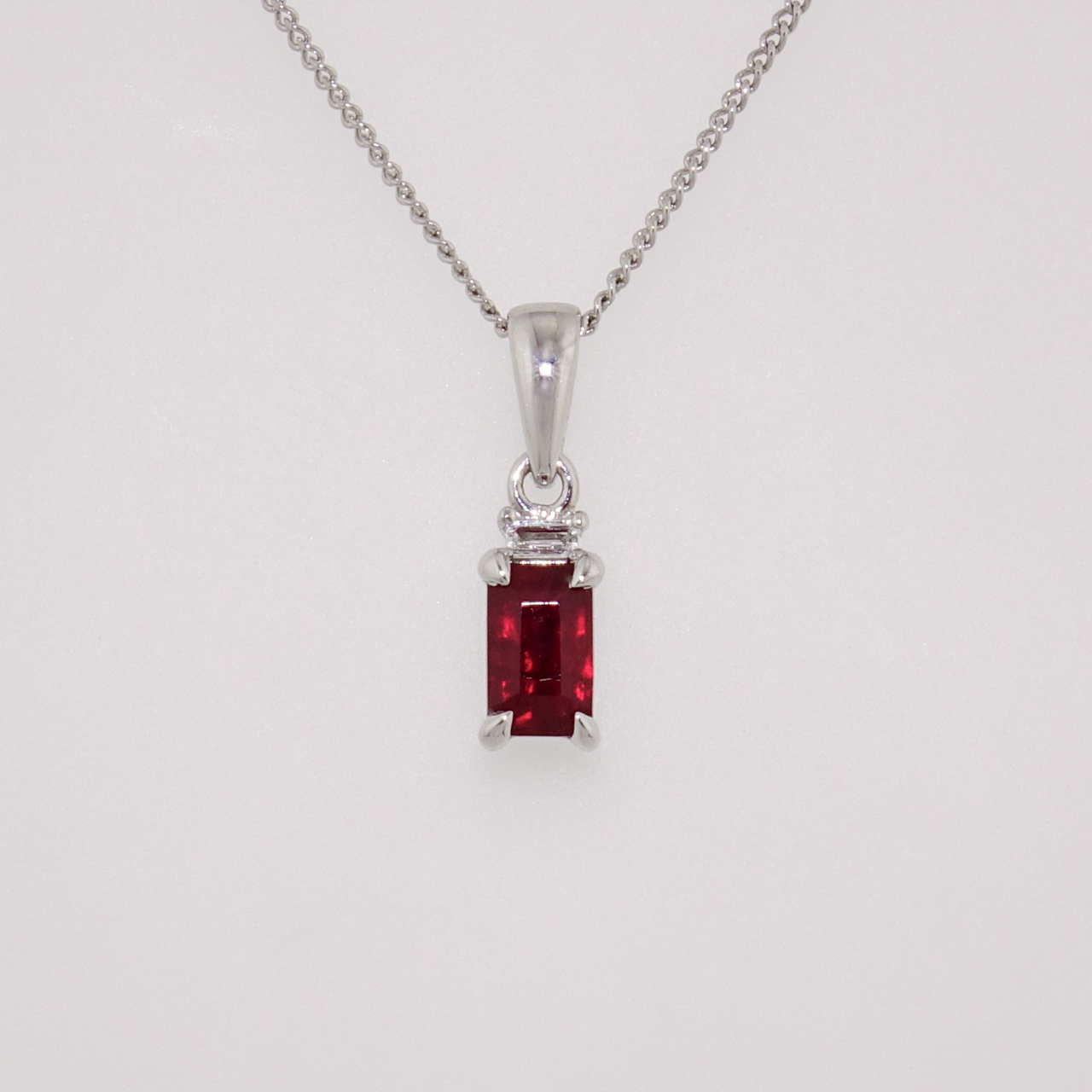 This stunning pendant features an emerald cut ruby set below a sparkling baguette cut diamond.