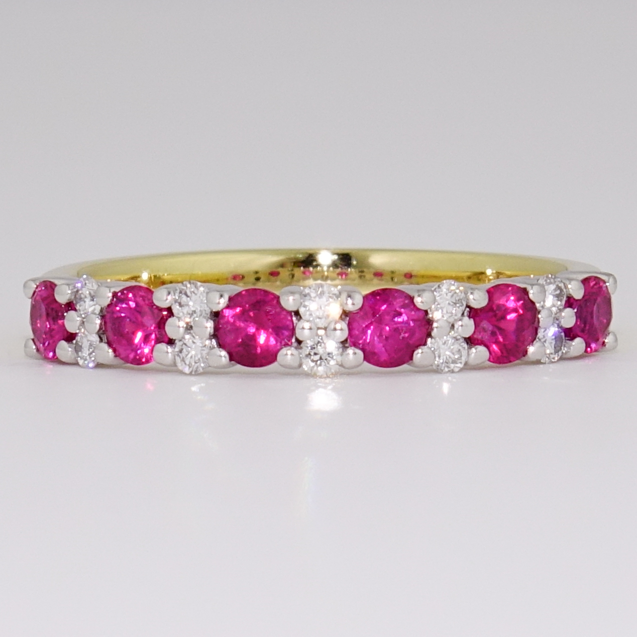This stunning ring features six round cut rubies with two round brilliant cut diamonds between each one.