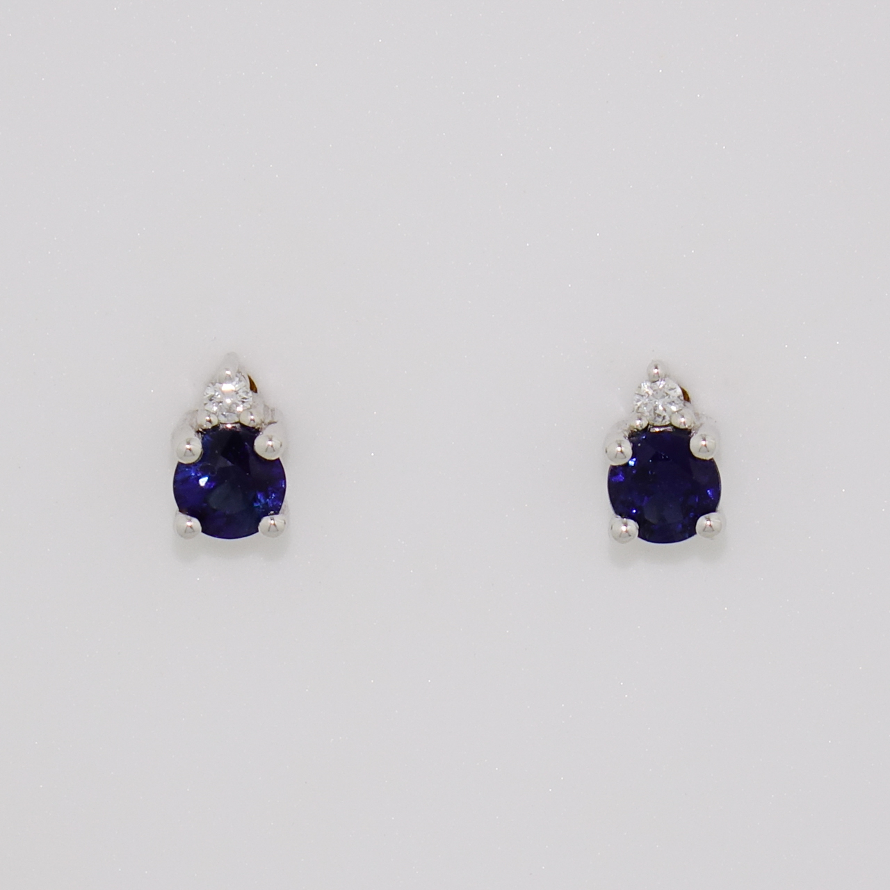 These dainty earrings feature round cut sapphires and round brilliant cut diamonds. The gemstones themselves are set in 18ct white gold, while the secure and comfortable post and butterfly fittings are 18ct yellow gold.