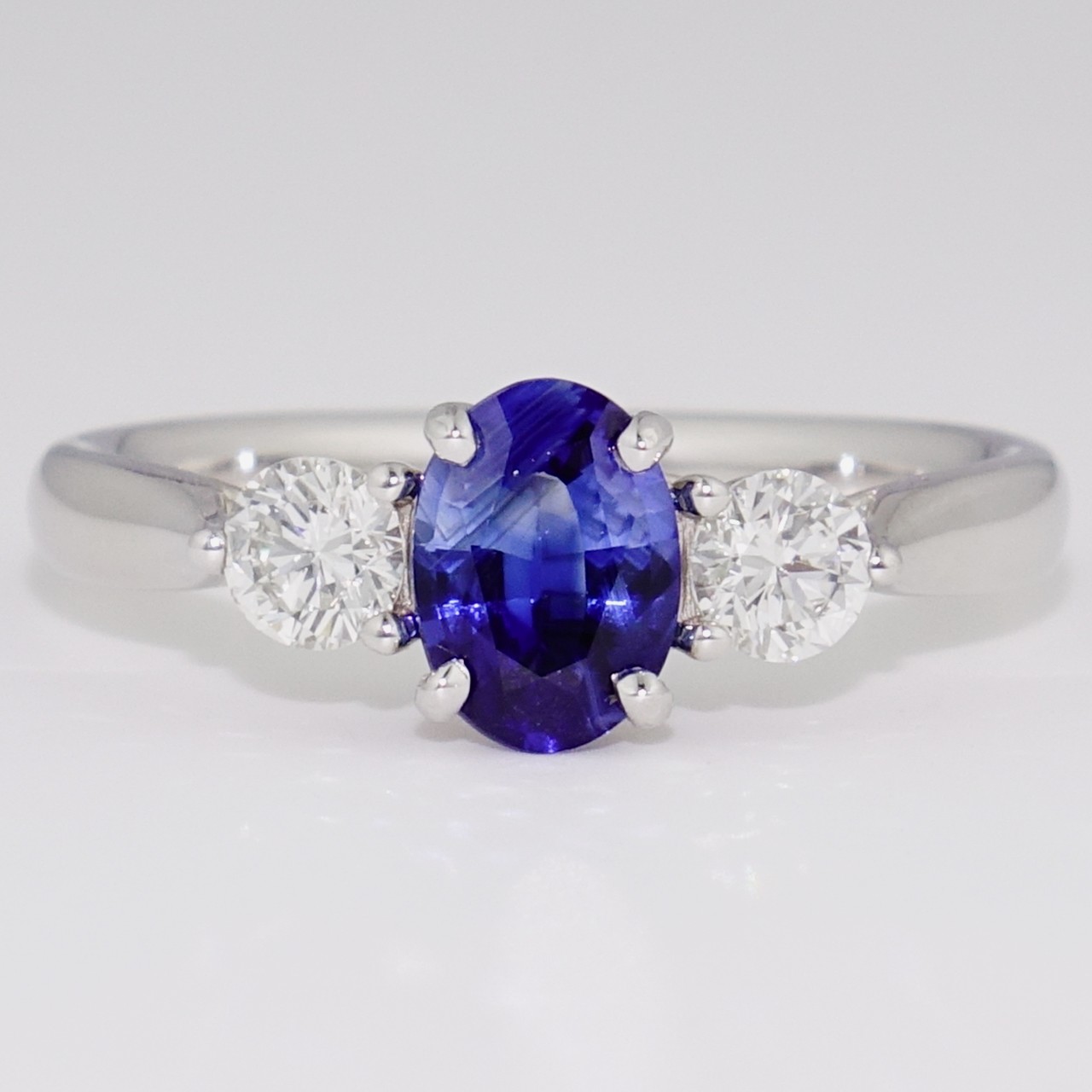 We've set this stunning oval cut sapphire, which was found in Sri Lanka, with two round brilliant cut diamonds in this beautiful ring.