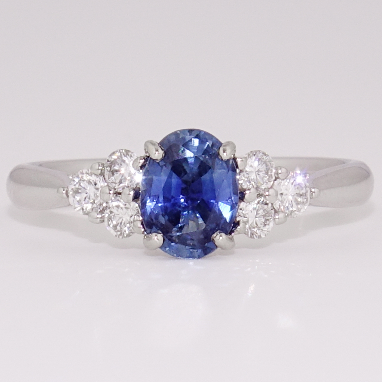 We've set this stunning oval cut Ceylon sapphire with six round brilliant cut diamonds in this beautiful ring. This sapphire was found in Madagascar and is a fine example of this beautiful gemstone.