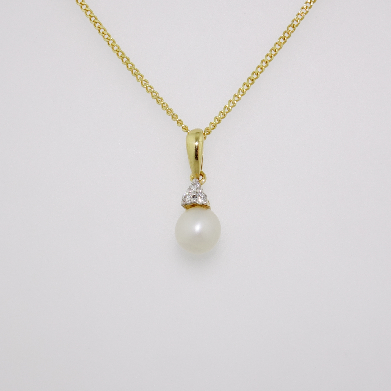 We've set this beautiful round Scottish freshwater pearl below three sparkling round brilliant cut diamonds in this classic pendant.