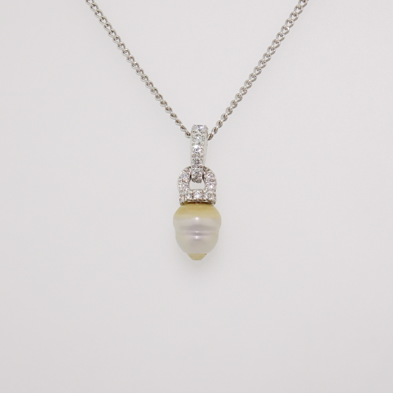 We've set this beautiful baroque Scottish freshwater pearl below with a sparkling diamond-set loop and bail in this stunning pendant. This unique pearl has a distinctive acorn shape adding interest.
