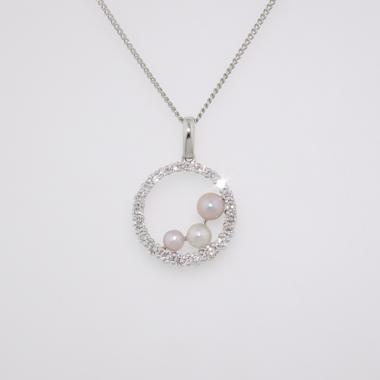 We've set three round multicoloured Scottish freshwater pearls inside a sparkling diamond-set circle in this unique pendant.