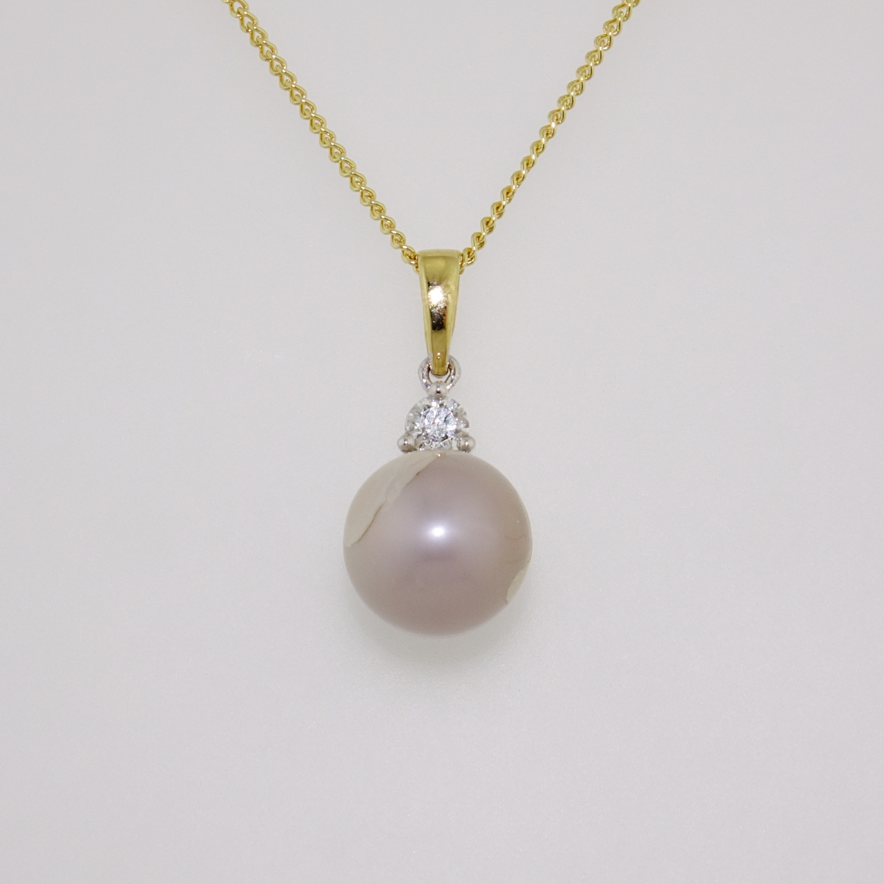 We've set this exceptional Scottish freshwater pearl below a single round brilliant cut diamond in this fabulous pendant. This pearl has a stunning lustre, which is complemented by the sparkling diamond.