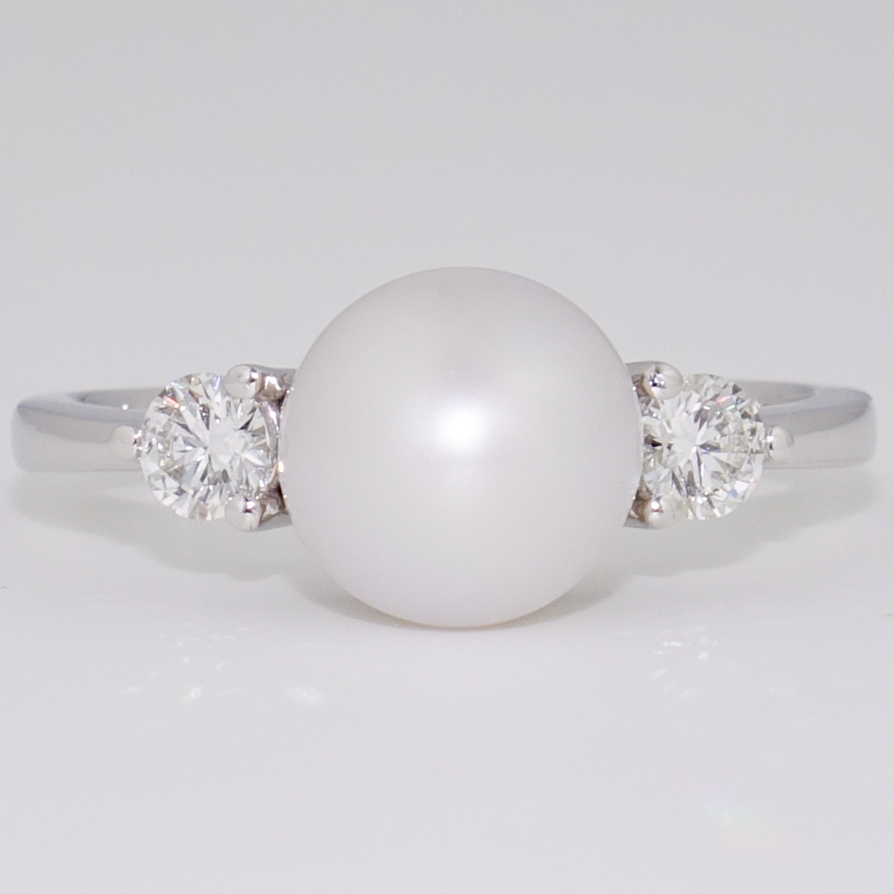 We've set this exceptional Scottish freshwater pearl between two round brilliant cut diamonds in this elegant ring. This pearl has a stunning lustre, which is complemented by the sparkling diamonds, and it is accompanied by a report from The Gem & Pearl Laboratory.