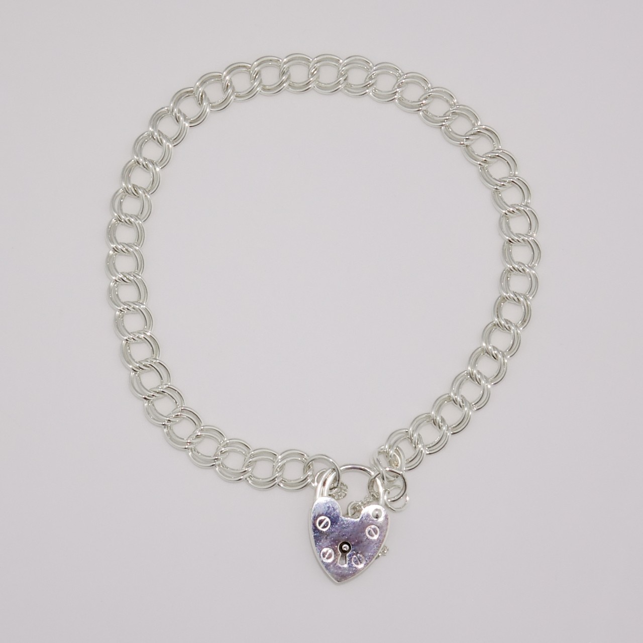 This classic bracelet features double links, a heart-shaped padlock and a safety chain.