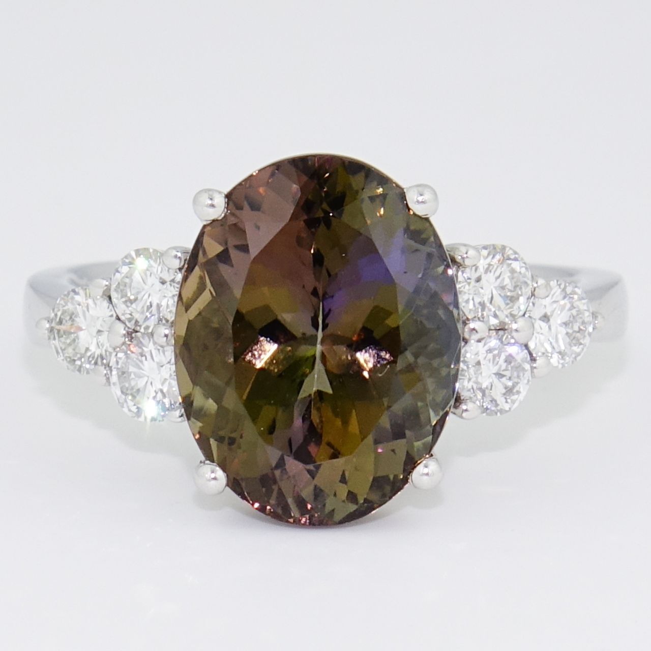 We've set this unique oval cut tanzanite with six sparkling round brilliant cut diamonds in this fabulous ring. This tanzanite has a gorgeous earthy colour with flashes of purple, making it fascinating to wear.