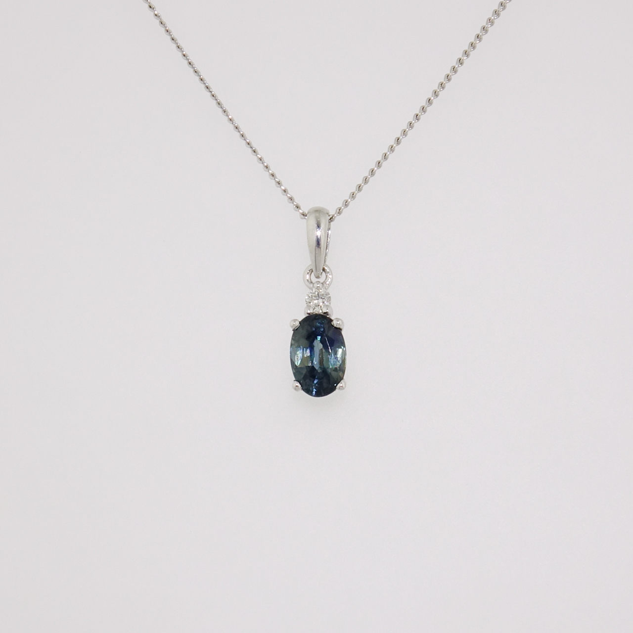9ct white gold teal sapphire and diamond pendant.