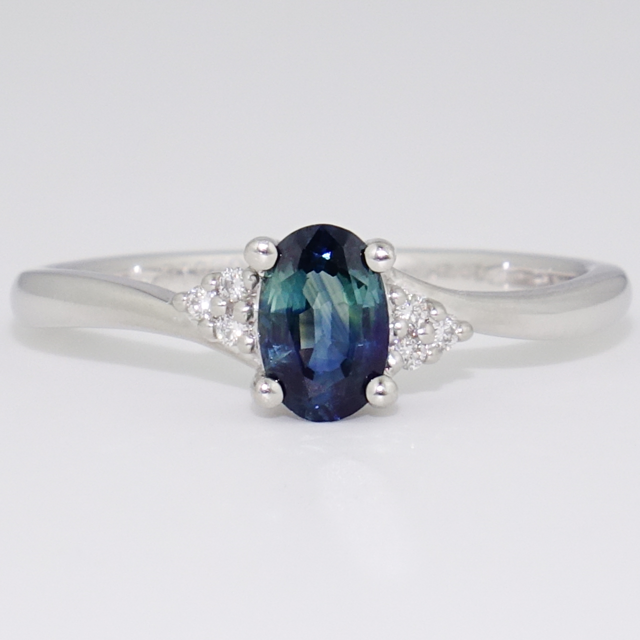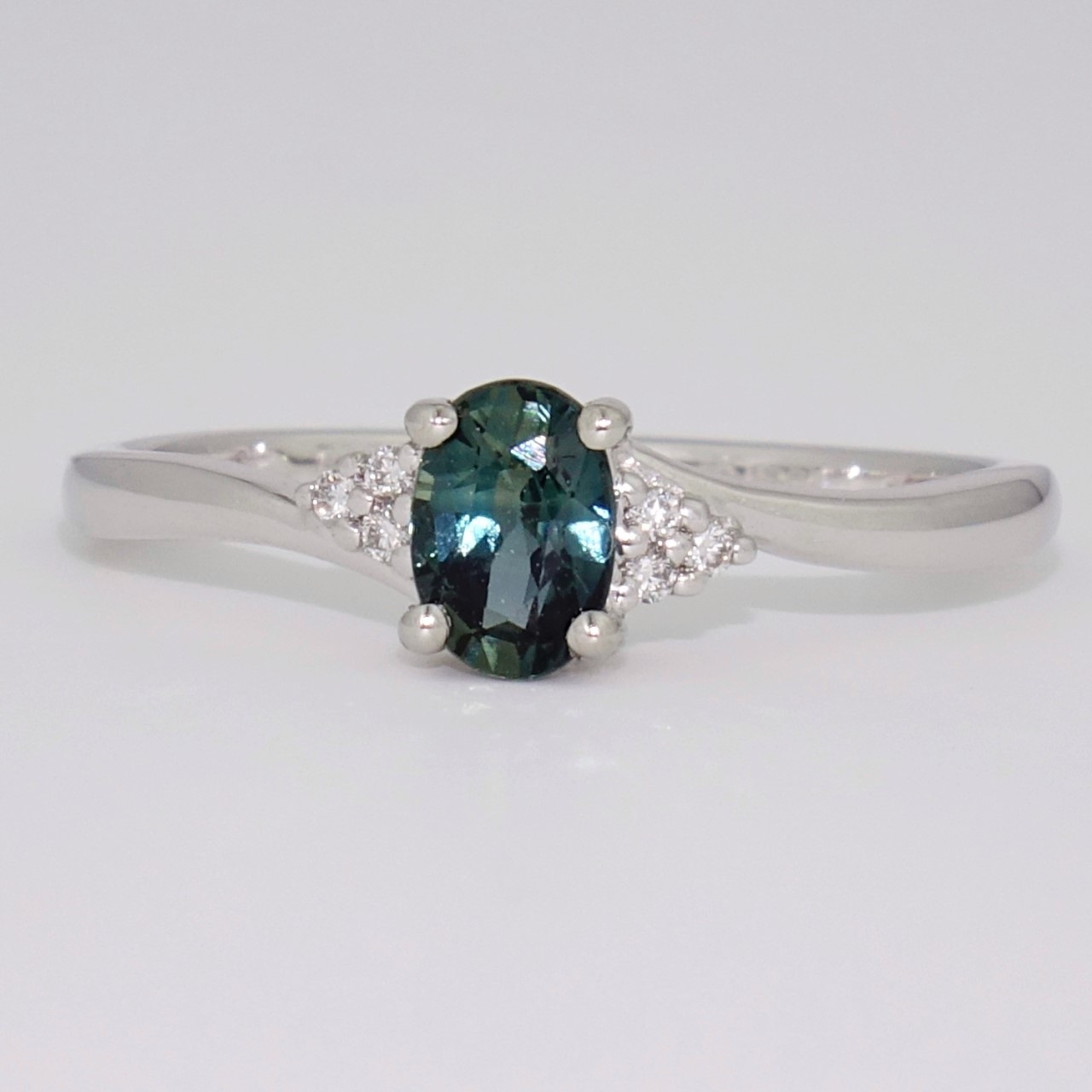 We've set this oval cut teal sapphire with six round brilliant cut diamonds in this popular twist ring.