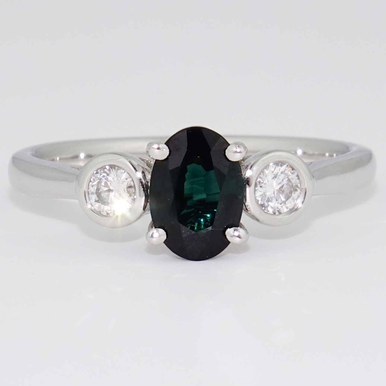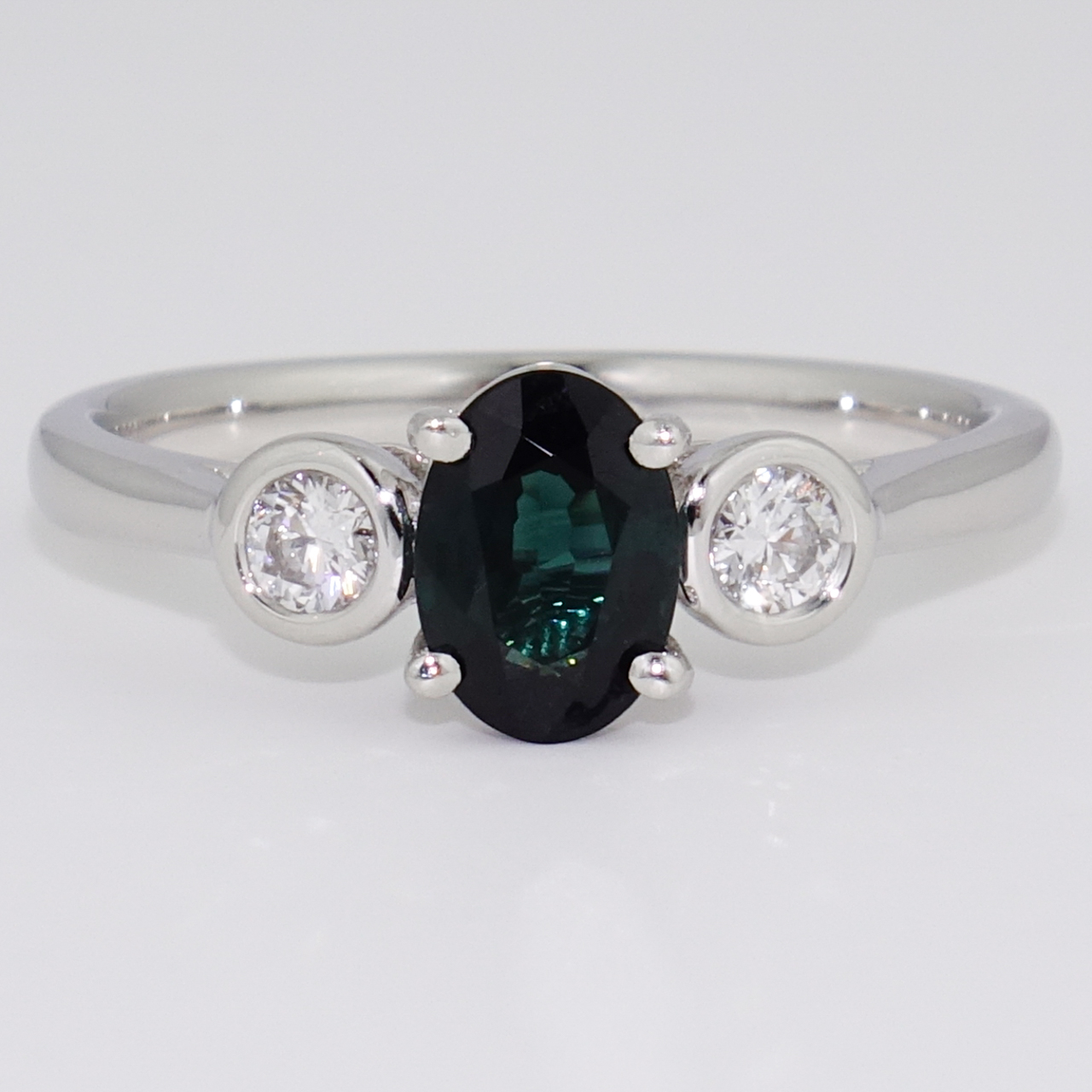 We've set this oval cut teal sapphire between two rubover-set round brilliant cut diamonds in this unique ring.