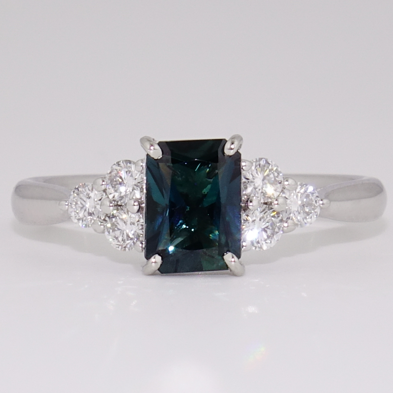 We've set this stunning radiant cut teal sapphire, which was found in Australia, with six sparkling round brilliant cut diamonds in this fabulous ring.