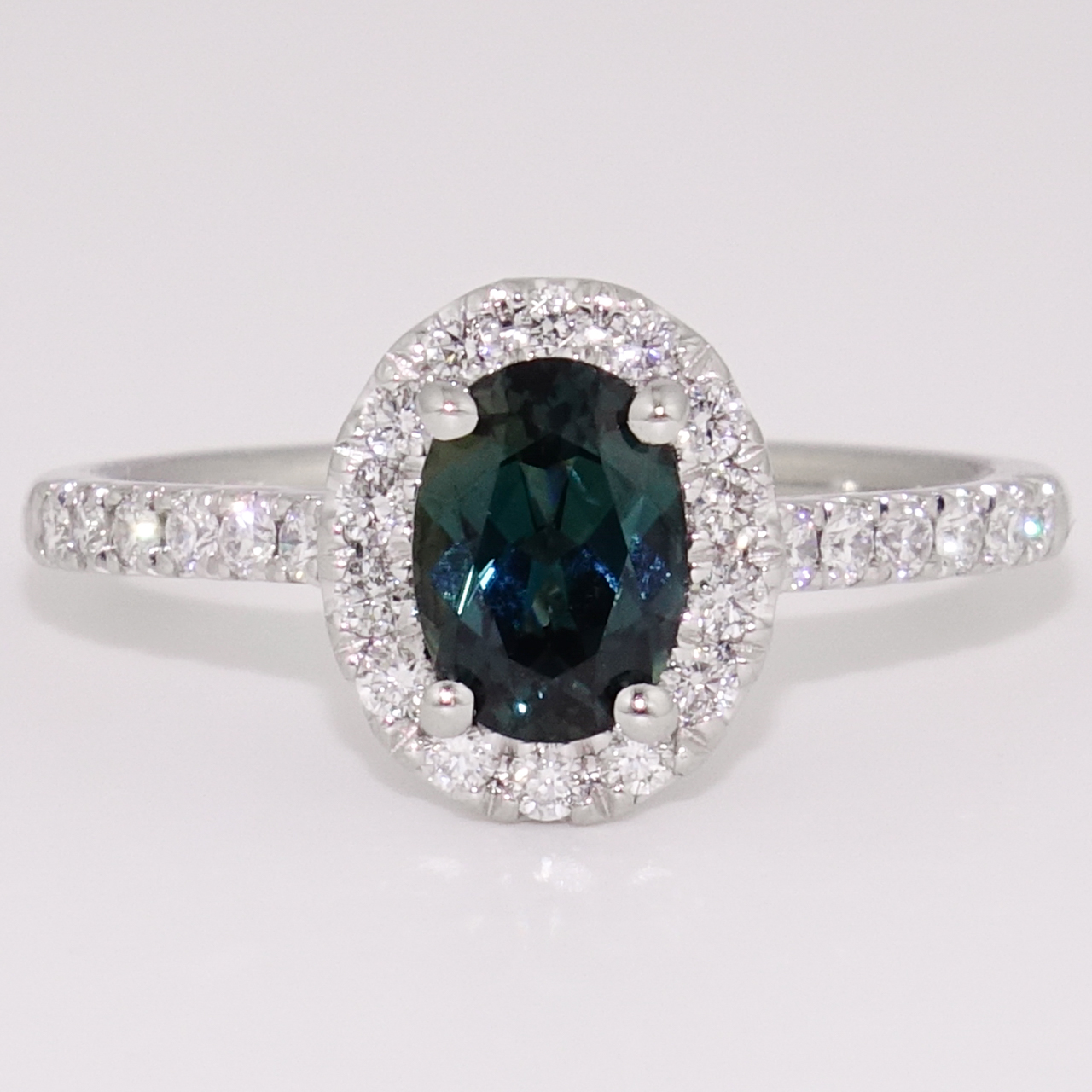 We've surrounded this oval cut teal sapphire with a cluster of sparkling round brilliant cut diamonds in this stunning ring. Diamond-set shoulders add plenty of extra sparkle. We've designed this ring to sit perfectly beside another ring, too, if you wish.