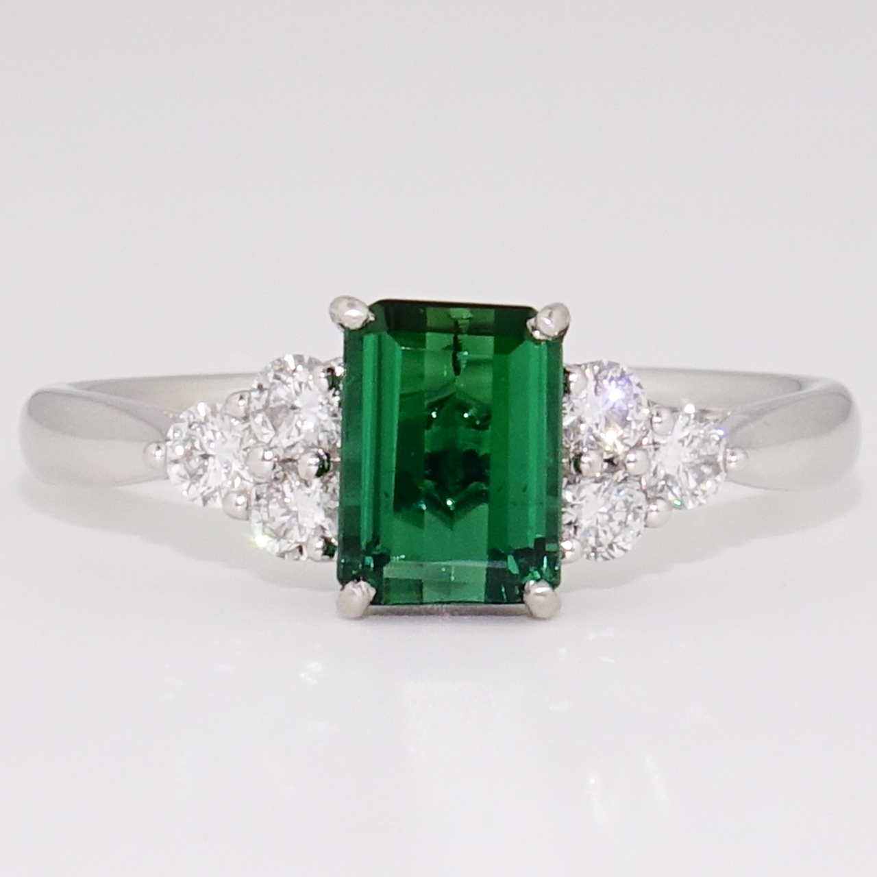 We've set this stunning octagonal cut tourmaline with six round brilliant cut diamonds in this eye-catching ring. This tourmaline has a wonderful colour saturation, which is complemented beautifully by the sparkling diamonds.