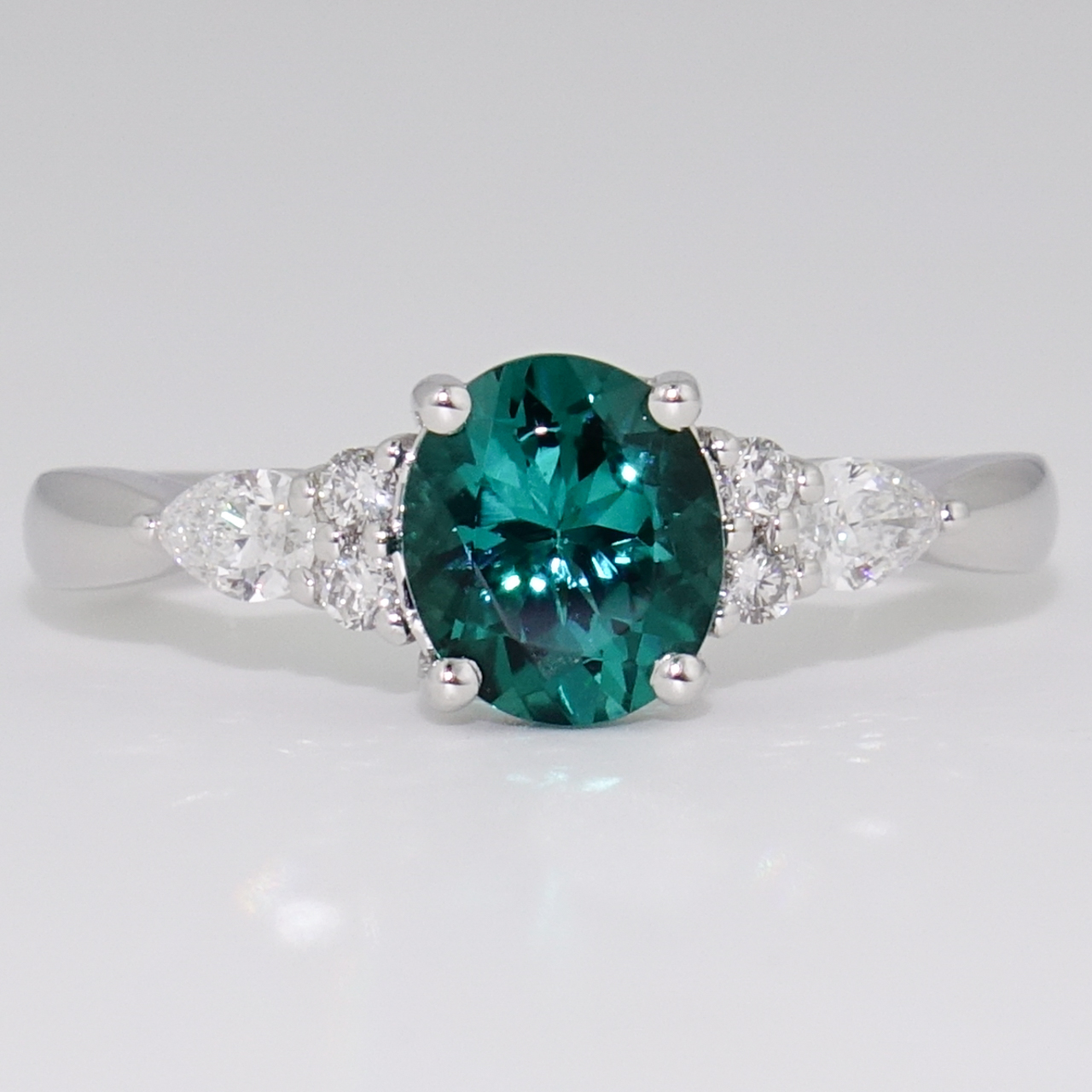 We've set this captivating fancy oval cut indicolite tourmaline, which was found in Namibia, with two round brilliant cut diamonds and one pear cut diamond on either side in this stunning ring. The colour of this tourmaline is truly stunning, and it's complemented beautifully by the sparkling diamonds.