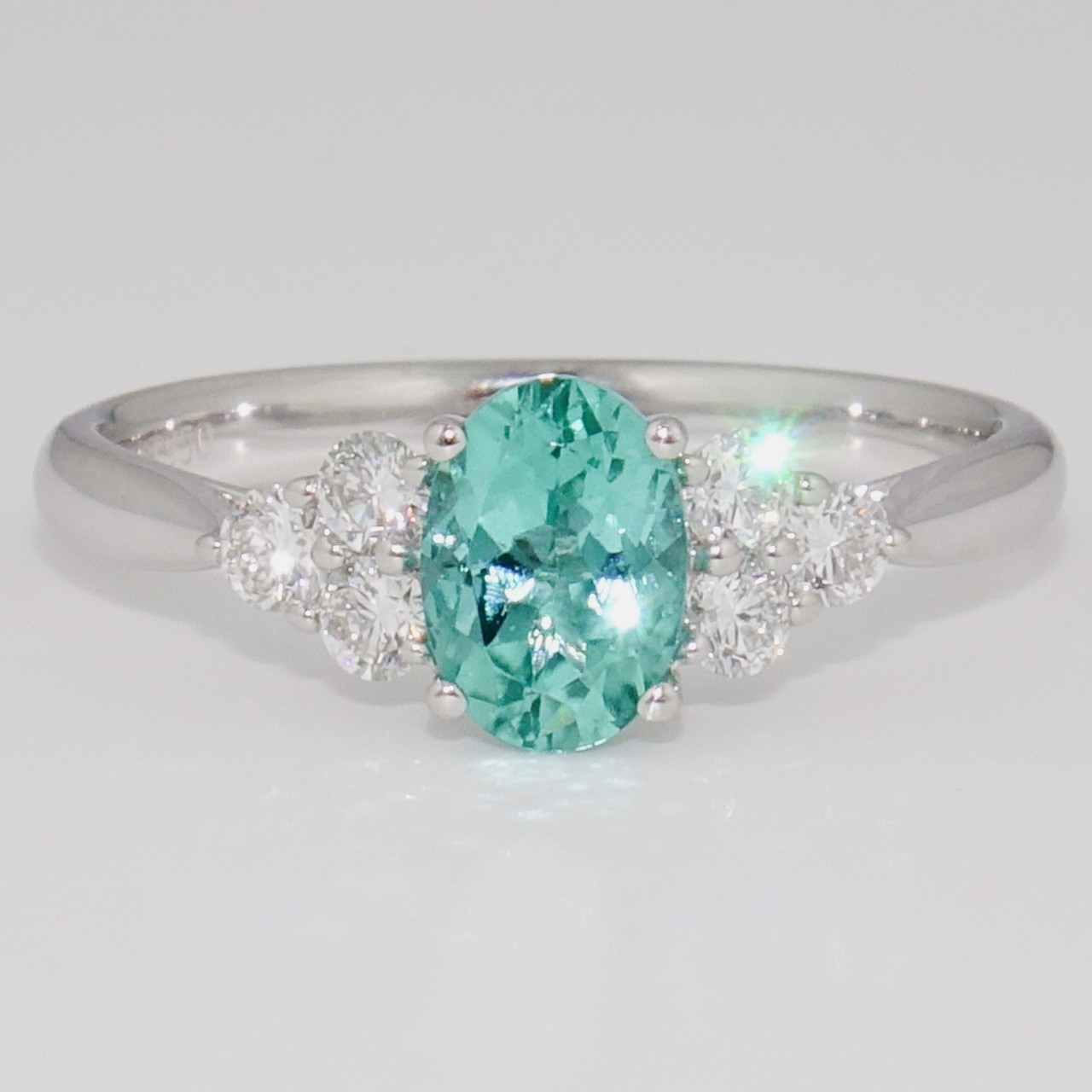 We've set this stunning oval cut tourmaline with six round brilliant cut diamonds in this stunning ring. This tourmaline was found in Afghanistan and has a vibrant blue-green colour.