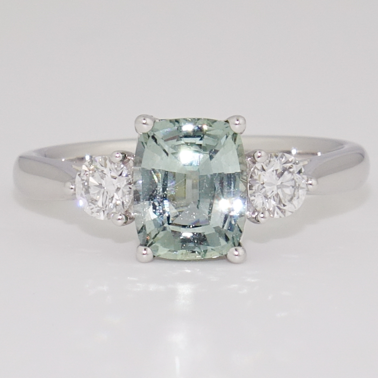 We've set this gorgeous rectangular cushion cut unheated green sapphire between two round brilliant cut diamonds in this stunning ring. This sapphire was found in Madagascar, and it has a stunning pastel green colour, which is complemented beautifully by the sparkle of the diamonds.